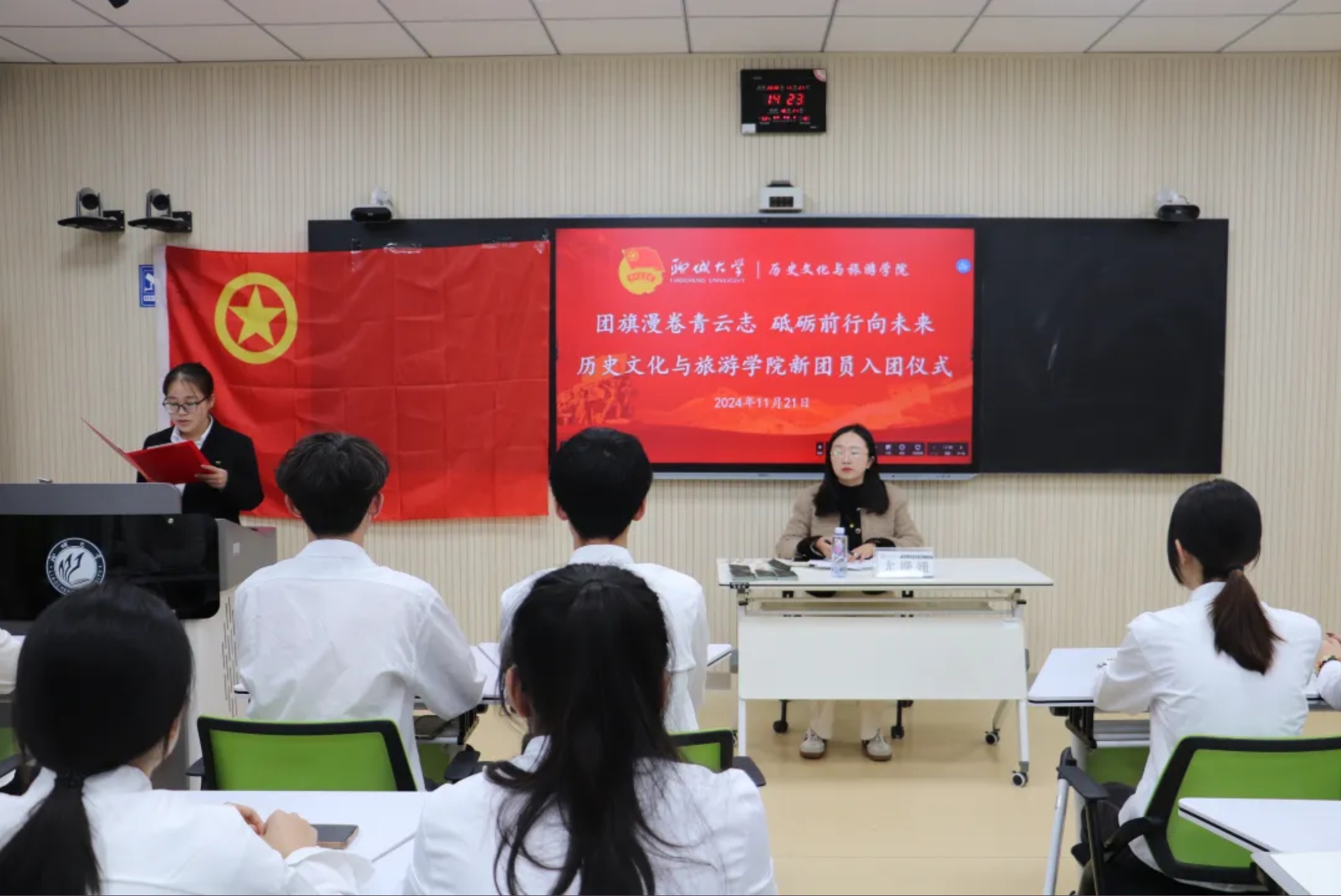 于6#401教室举办2024年度新团员入团宣誓仪式。辅导员尤姗姗、优秀团员代表以及新发展团员参与此次新团员入团宣誓仪式。 随着国歌的响起,入团仪式拉开序幕。主持人宣读新团员名单,并带领全体新团员面向团旗庄严宣誓。经过团组织的培养考察,共有23名先进青年发展入团,尤姗姗为新团员佩戴团徽。 团员代表韩世聪带领新团员面向团旗进行庄严宣誓。新团员代表李萍激励广大青年团员树立远大理想,将个人理想融入于国家和民族的复兴事业中。 尤姗姗总结发言,她指出新发展团员应把爱国主义情怀融入到个人理想当中,以更高的标准严格要求自己。最后,全场齐声高唱《中国共青团团歌》,仪式在嘹亮歌声中圆满落下帷幕。 此次入团宣誓仪式,有利于培养青年的爱党爱国情怀,增强共青团员的责任感和使命感,以昂扬的姿态团结在团旗下,高扬理想的风帆,焕发青春的激情,向着新目标扬帆远航。 2023级7班韩丰竹:作为共青团员,我深知个人的成长与国家的命运紧密相连。在青春的征途上,我将继续秉持“携手并进,共筑梦想”的信念,与志同道合的伙伴们一起,用实际行动诠释青春的意义,为实现中华民族伟大复兴的中国梦贡献青春力量。让我们携手前行,不负时代,不负韶华,共同书写属于我们这一代人的辉煌篇章! 2023级6班裴一玮:当我站在仪式现场,目睹着鲜艳的旗帜,耳边回响着激昂的誓言,我感受到了一种强烈的使命感。我深知,入团不仅仅是一种荣誉,更是一种责任。我将以更加积极的态度投入到团队中,与大家一起学习、一起成长。我将努力提升自己的综合素质,为团队的发展贡献自己的力量。同时,我也将时刻铭记自己的团员身份,以身作则,传递正能量,为团队树立良好的形象。 (供稿:孙蕾 刘舒雅 摄影:陆雅馨 初审:刘舒雅 复审:张程程 终审:石晓晗)
