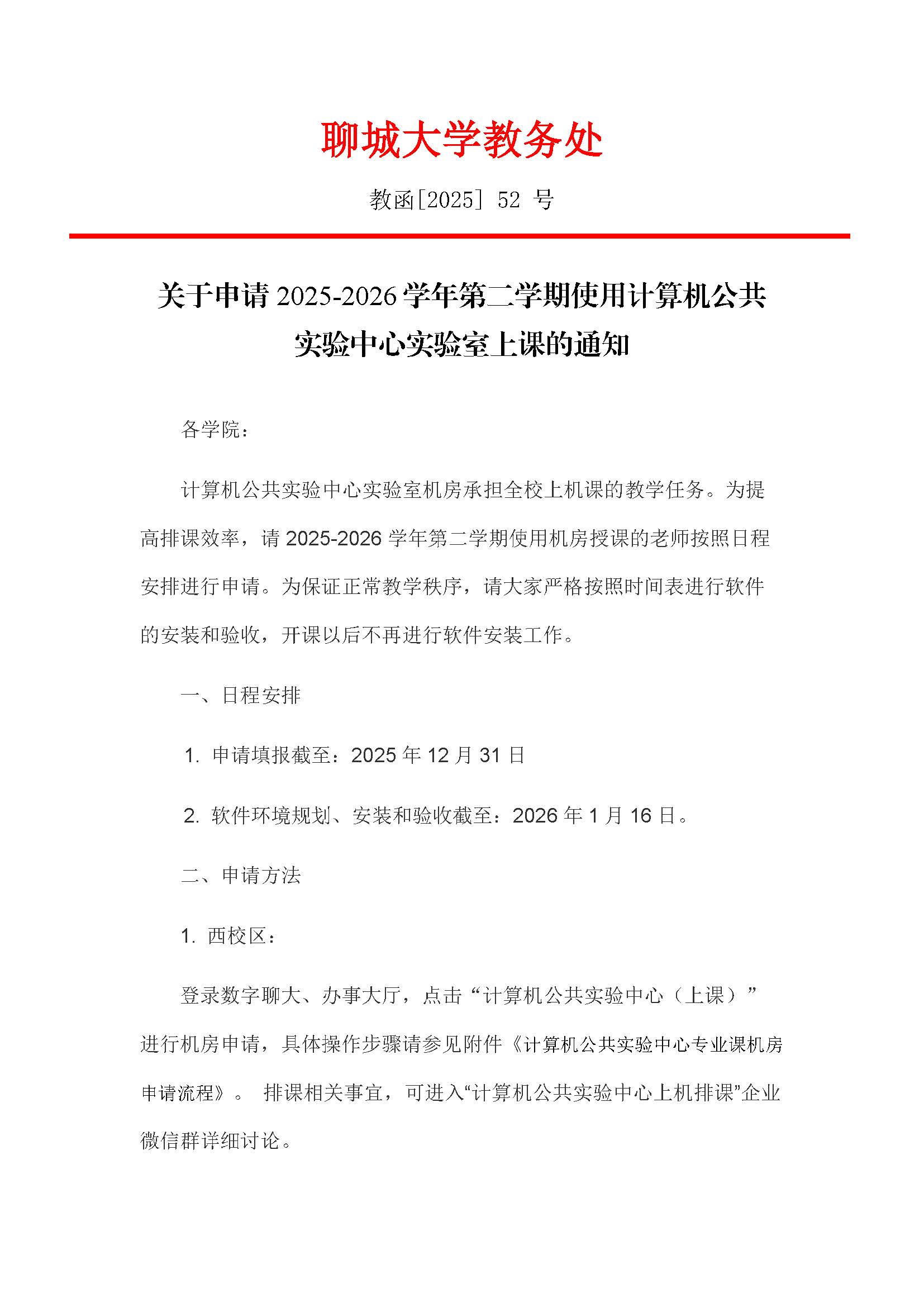关于申请2025-2026学年第二学期使用计算机公共实验中心实验室上课的通知