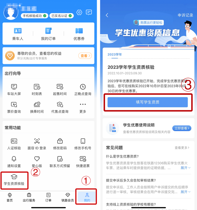 关于2024级本科新生在线核验火车票优惠资质的通知 各学院: 根据《教育部办公厅 国铁集团办公厅关于进一步便利普通高等学校学生购买优惠火车票的通知》(教学厅函〔2023〕4号)精神,现将本科新生在线核验火车票优惠资质及学生证乘车区间填写要求等有关事项通知如下: 一、学生证乘车区间填写要求 各学院组织申请火车票优惠资质的学生填写《新生火车票优惠资质乘车区间统计表》(附件1,学院留存)、填写学生证家庭所在地及乘车区间,学生乘车区间应为学校所在地至家庭所在地,或父母实际居住地,学校所在地火车站填“聊城”,家庭所在地车站需按铁道购票部门规定标准的车站名称填写(以铁道部12306网站查询的站名为准),学院审核学生填报信息无误后,在学生证乘车区间页加盖学院公章。 二、在线优惠资质核验 学生在“铁路12306”APP学生专区填写个人信息及乘车区间,用于学生优惠资质核验;《新生火车票优惠资质乘车区间统计表》、学生证、“铁路12306”APP三处填写的乘车区间必须一致。 三、“铁路12306”APP学生专区填报指南 第1步:学生登录铁路12306手机客户端,右下角“我的”页面中点击“学生优惠资质核验”专区。如果当前用户是“已注册会员”或“已经在本机完成了人脸认证”则可直接点击“填写学生资质”核验学生资质信息。 第2步:根据学生证信息如实填写学校所在地车站、家庭所在地车站(申请时准确填写个人信息和与学生证上一致的优惠乘车区间!)、预计毕业年份等信息后,点击提交。提交学生资质信息后,若信息与学信网相匹配,后台将于3天内自动审核通过。 教 务 处 2024年9月24日 教育部办公厅 国铁集团办公厅关于进一步便利普通高等学校学生购买优惠火车票的通知 //www.moe.gov.cn/srcsite/A15/s7063/202306/t20230605_1062839.html
