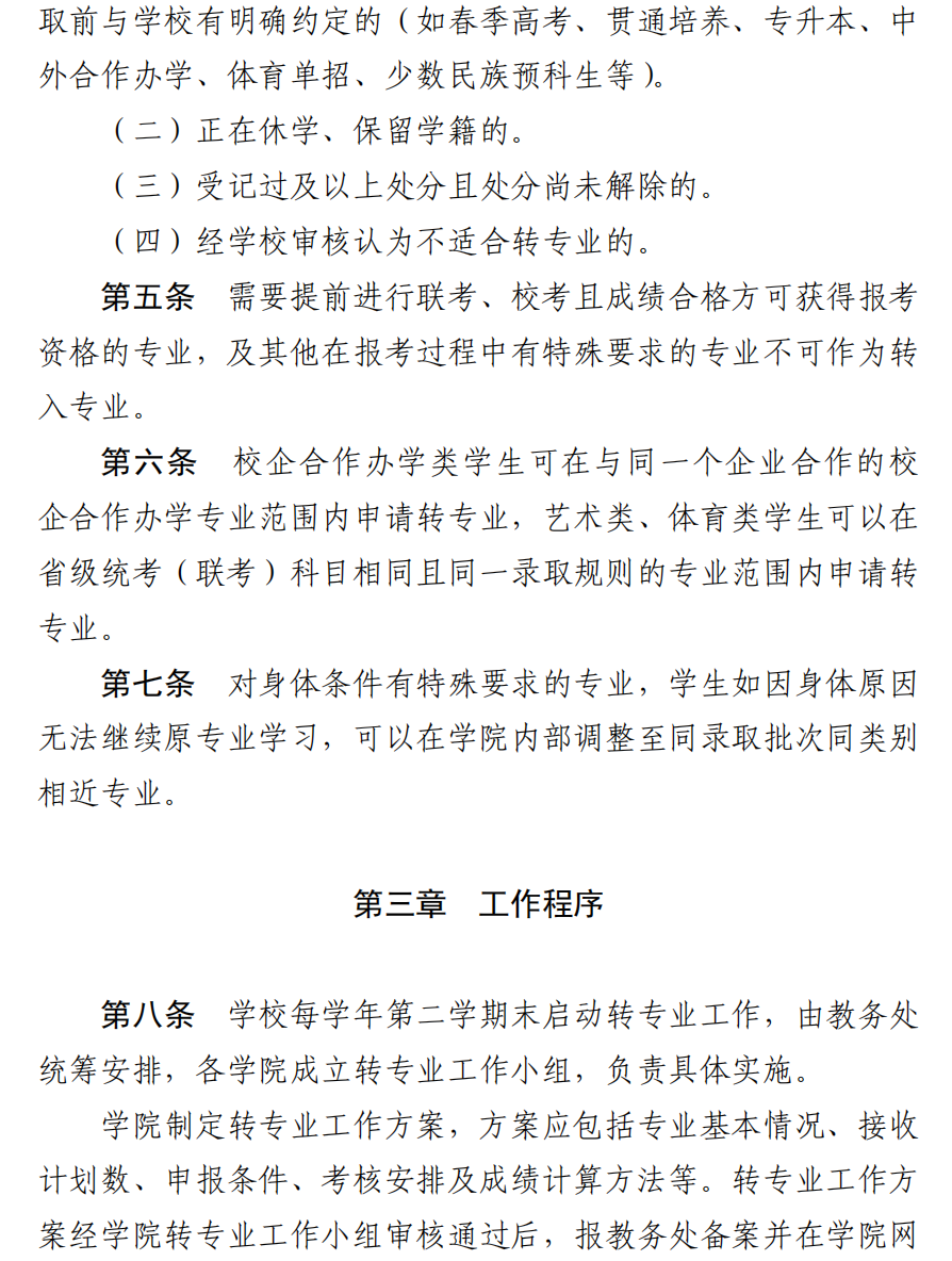 2025年普通全日制本科学生转专业工作安排 注意事项 1.转入专业对学生高考选考科目有要求的,须在转专业工作方案申报条件中明确说明。 2.申请转专业的学生须关注拟转入学院网站,及时查看学院工作方案、工作安排、结果公示等信息,严格按学院工作安排参加考核选拔,不参加考核的视为放弃资格。 3.请学院及时向学生公布相关信息,解答学生咨询,做到公平、公正、公开。 4.转专业学生补修转入专业大一开设的课程,原大一已修课程可申请课程认定,具体按照《小妲己直播