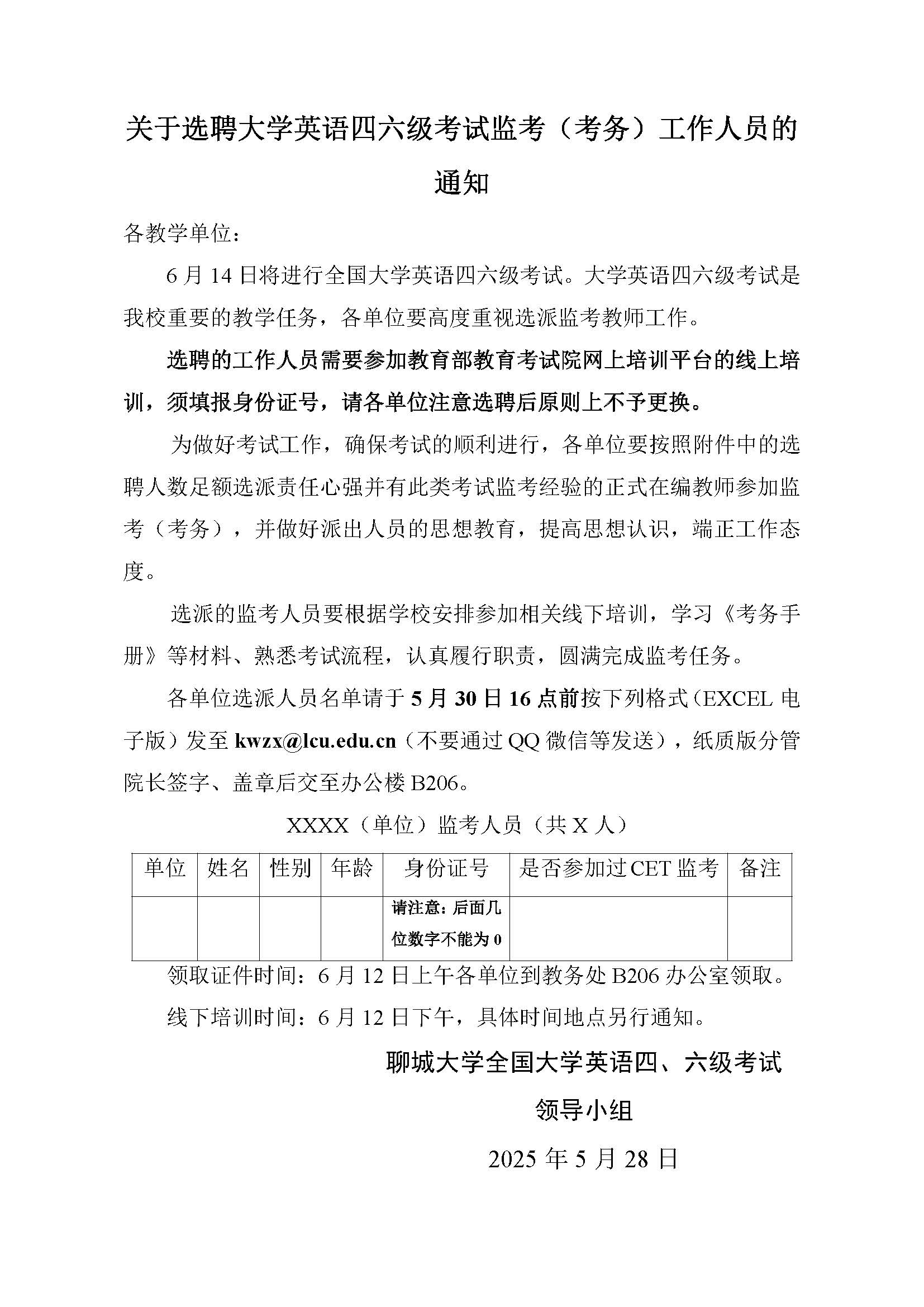 关于选聘大学英语四六级考试监考、考务工作人员的通知