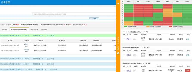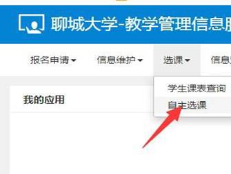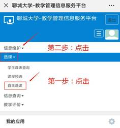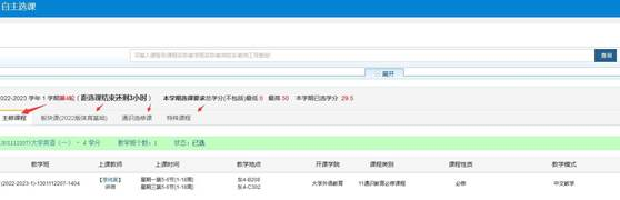 教务处微信公众号,教务服务菜单——教务系统,转到数字聊大登录后,进入教务系统。 三、选课操作说明 1.导航菜单——选课——自主选课,打开选课界面。 2.点击查询(不选填查询条件,保持空白查询所有可选内容)后,会出现“主修课程”、“板块课”、“通识选修课”和“特殊课程” 模块,分别点击各个模块,根据各学院专业要求进行选课操作,以板块课(体育基础)为例,根据个人爱好和已有课表安排,可选择不同项目 和不同老师课程,点击选课。 3.点击选课后,也可点击红色退选进行改选,确定后点击右侧黄色列条进行查看已选课程进行核实。 4.选课结束后,可在“信息查询”下点击“学生课表查询”,查看本学期 的课程表。 教务处网络中心 2025年9月10日