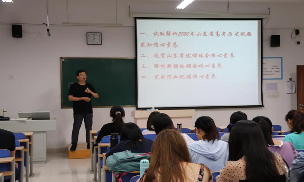 专业硕士研究生同学们作了题为“中学历史教学方法问题”的系列讲座。 本次讲坛共分为四讲内容。第一讲主题为“试做高考试题,分析核心素养”。司老师带领同学们重温了2020年高考历史真题,将高考真题中的考察点与新课改对培养历史学科核心素养的要求相结合,重点阐释了在教学中历史解释与历史理解的内涵和外延的不同点。第二讲主题为“落实核心素养的课堂设计”。司老师与同学们共同观看了山东省初高中历史课堂优质课视频,通过点评与讨论视频,使同学们深刻了解了在教学中形象化解释历史学科相关专业术语和概念的重要性。第三讲主题为“解读课程标准,感悟核心素养”。司老师在此讲中指出,历史学科的五大核心素养是一个整体,反映了不同方面的要求,在实际教学中不可分割,切忌贴标签。五大核心素养相辅相成,缺一不可。其中,唯物史观是历史学科核心素养体系的灵魂,分析问题要以马克思主义唯物史观作为统领;时空观念是了解历史的基础;史料实证是理解和解释历史的关键;历史解释是检验学生历史观、历史知识方法的主要指标。第四讲主题为“课后作业与考试设计”。司老师认为,在教学中课后作业与考试设计均要结合学习内容,以培养历史学科学习能力、增强核心素养为目标。 通过本次讲座,同学们深入了解了高中历史教学中的课程标准与核心素养要求,也使同学们对中学历史教学方法有了更深刻的认识,为日后的学习与工作积累了经验,指明了方向。 专家简介: 司宝海,1987年毕业于聊城师范学院历史系,现为济南外国语学校历史教师,中学正高级教师,全国优秀教师,山东省特级教师,小妲己直播