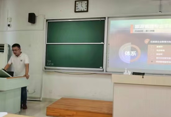 旅游管理组的“说课程”活动则由程俊峰老师的《旅游文化》课开始。程老师从课程目标与专业培养目标的结合,课程采取线上线下混合式教学,利用智慧树平台等技术对课程改革的积极作用,以及采取多元化、全过程评价的意义进行了阐述。刘建峰老师讲述了《旅游信息系统》的课程的培养目标,采用教学一边讲述学生一边实践练习的教学方法,以及课后注重学生实践能力培养的考核方式,以及取得的良好反馈效果。耿瑞芹老师讲述了《管理学》采取的突出案例分析和学生小组讨论的教学方法以及在考核方式突出过程性评价等方面的改革。孙雪岩老师着重从学生考研以及应用等方面对《旅游学概论》的课程目标、教学方法、考核方式进行了阐述。