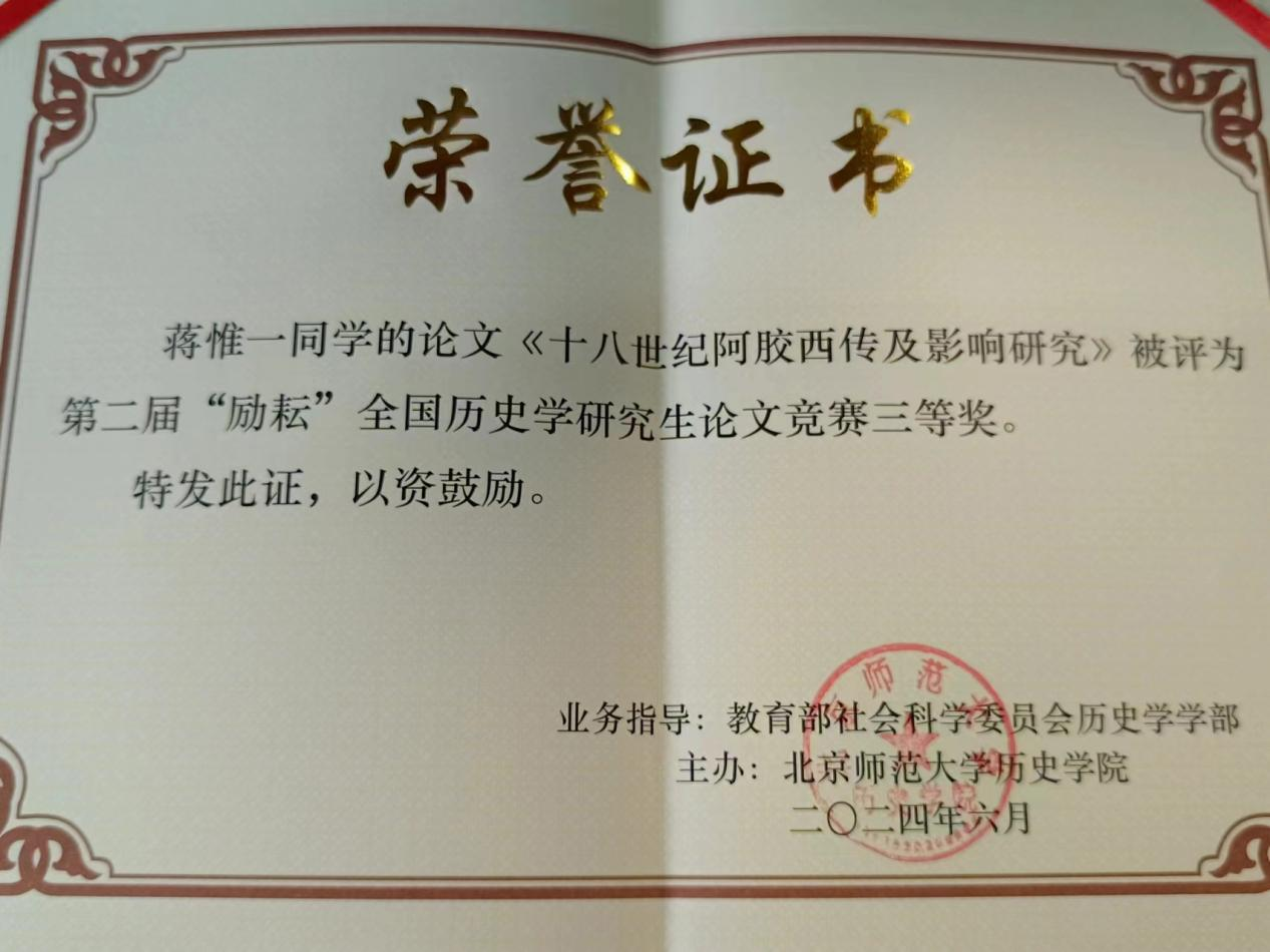 小妲己直播 学子获评第二届“励耘”全国历史学研究生论文竞赛三等奖