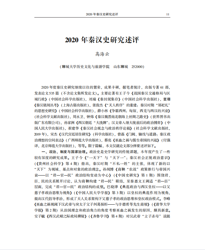 学术简报丨高海云:2020年秦汉史研究述评