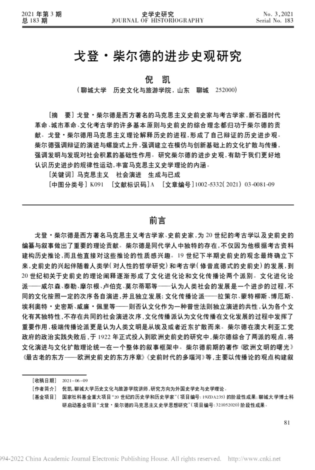 博士科研启动基金项目“戈登·柴尔德的马克思主义史学思想研究”阶段性成果 该文刊发于《史学史研究》2021年第3期