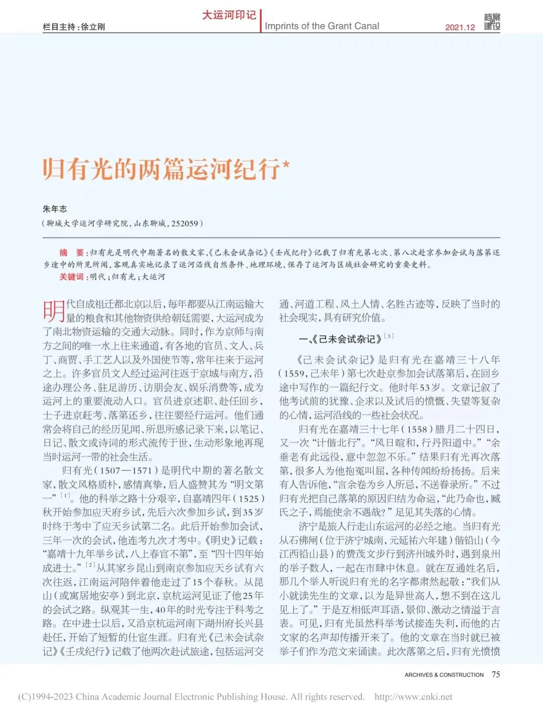 摘要:归有光是明代中期著名的散文家,《己未会试杂记》《壬戌纪行》记载了归有光第七次、第八次赴京参加会试与落第还乡途中的所见所闻,客观真实地记录了运河沿线自然条件、地理环境,保存了运河与区域社会研究的重要史料。 关键词:明代;归有光;大运河; 基金赞助:全国高校古籍整理研究工作委员会直接资助项目“清代运河日记五种校注”(2046); 山东省社会科学普及应用研究项目“聊城运河文化保护传承利用研究”(2020-SKZZ-75)阶段性研究成果; 该文刊发于《档案与建设》2021年第12期