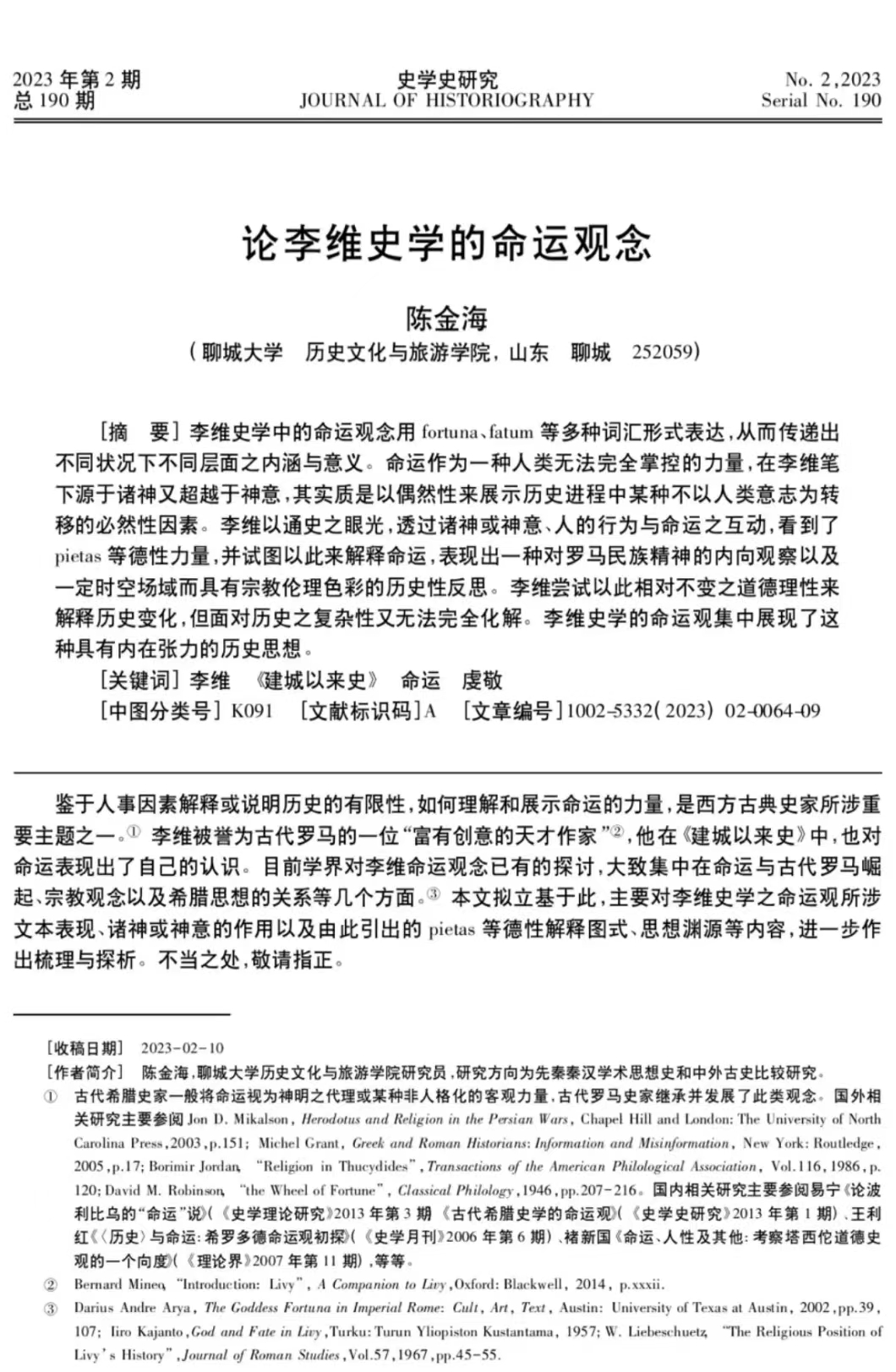 摘要:李维史学中的命运观念用 fortuna、fatum 等多种词汇形式表达,从而传递出不同状况下不同层面之内涵与意义。命运作为一种人类无法完全掌控的力量,在李维笔下源于诸神又超越于神意,其实质是以偶然性来展示历史进程中某种不以人类意志为转移的必然性因素。李维以通史之眼光,透过诸神或神意、人的行为与命运之互动,看到了pietas 等德性力量,并试图以此来解释命运,表现出一种对罗马民族精神的内向观察以及一定时空场域而具有宗教伦理色彩的历史性反思。李维尝试以此相对不变之道德理性来解释历史变化,但面对历史之复杂性又无法完全化解。李维史学的命运观集中展现了这种具有内在张力的历史思想。 关键词:李维;《建城以来史》;命运; 虔敬 该刊发于《史学史研究》(2023年第2期)