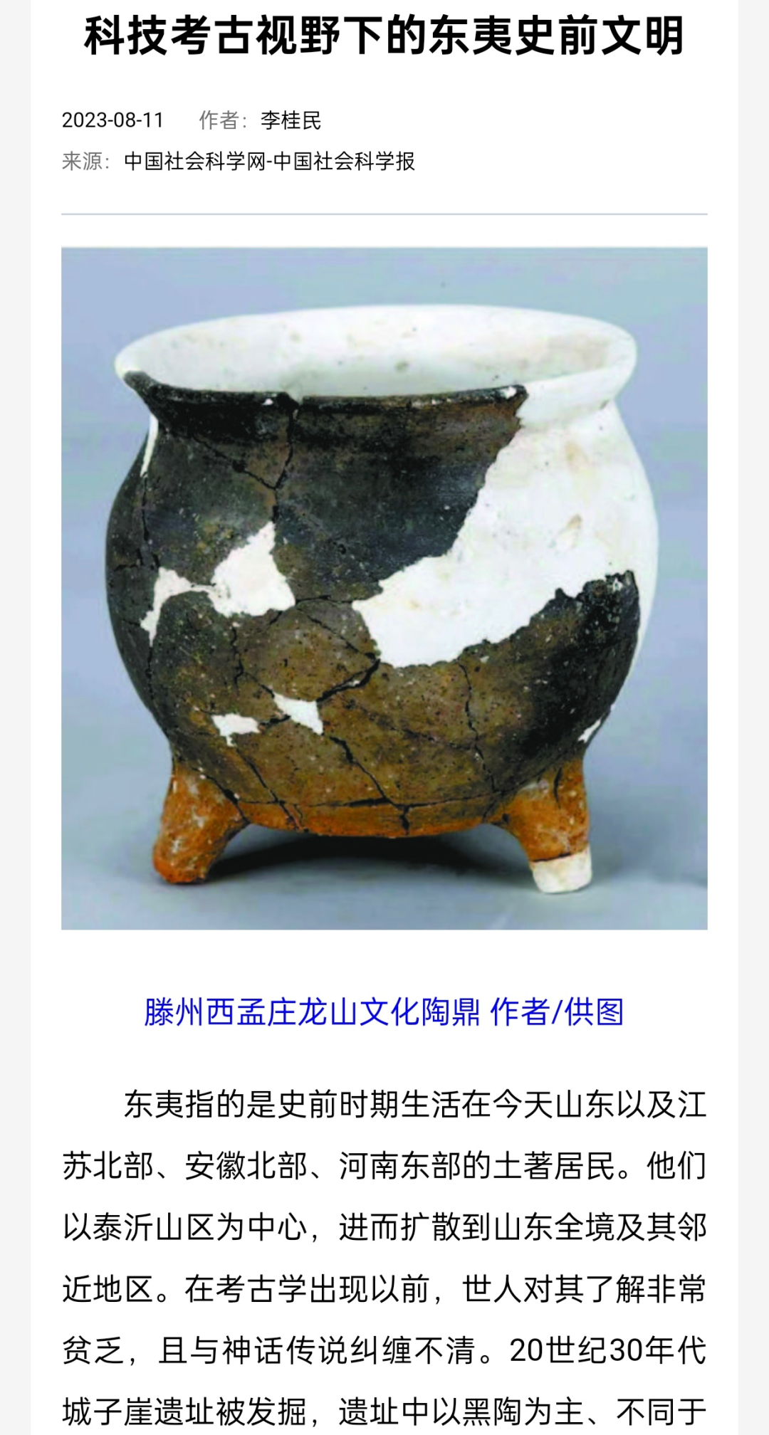 正文快照:东夷指的是史前时期生活在今天山东以及江苏北部、安徽北部、河南东部的土著居民。他们以泰沂山区为中心,进而扩散到山东全境及其邻近地区。在考古学出现以前,世人对其了解非常贫乏,且与神话传说纠缠不清。20世纪30年代城子崖遗址被发掘,遗址中以黑陶为主、不同于仰韶文化的文化特征引起学界关注,揭开了海岱地区东夷史前考古的序幕…… 关键词:科技考古;东夷史前文明 该刊发表于《中国社会科学报》2023年08月23日