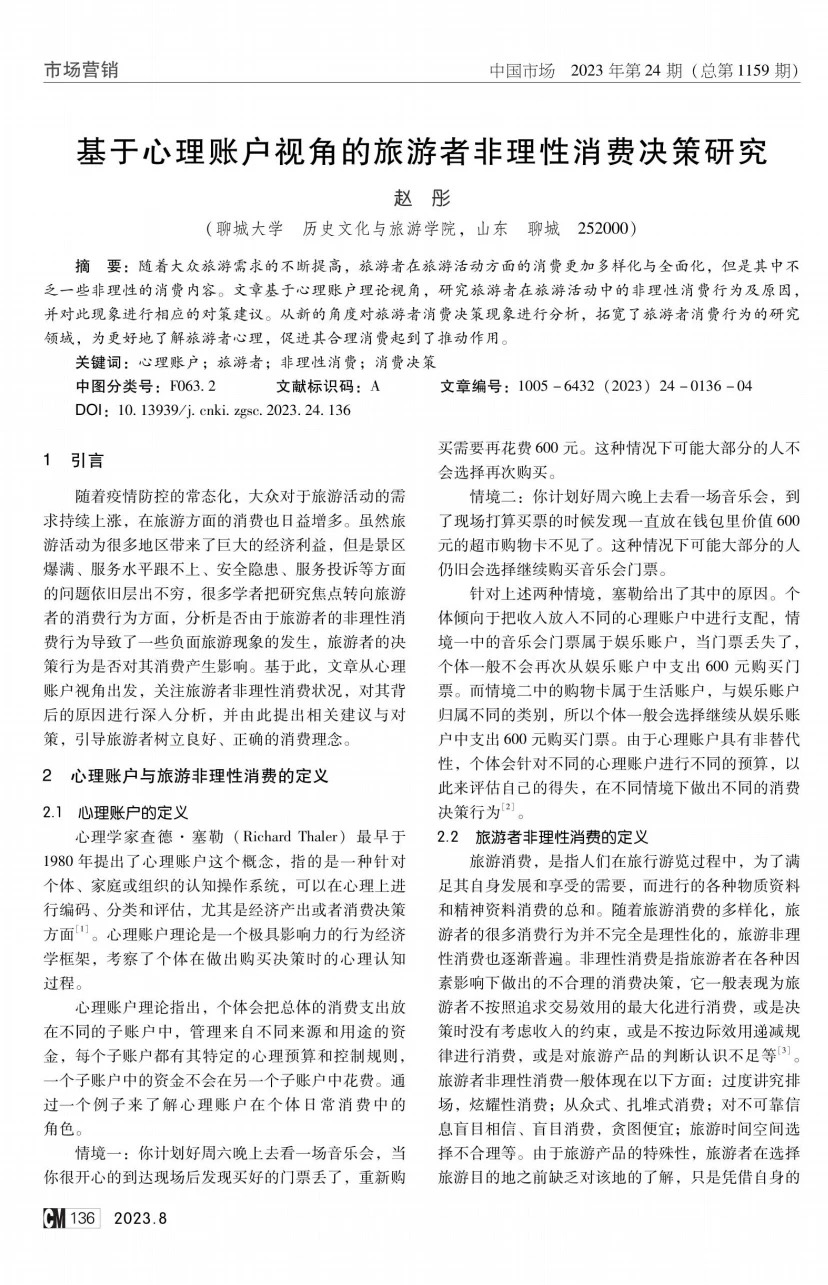 正文快照:随着疫情防控的常态化,大众对于旅游活动的需求持续上涨,在旅游方面的消费也日益增多。虽然旅游活动为很多地区带来了巨大的经济利益,但是景区爆满、服务水平跟不上、安全隐患、服务投诉等方面的问题依旧层出不穷,很多学者把研究焦点转向旅游者的消费行为方面,分析是否由于旅游者的非理性消费行为导致了一些负面旅游现象的发生,旅游者的决策行为是否对其消费产生影响。基于此,文章从心理账户视角出发,关注旅游者非理性消费状况,对其背后的原因进行深入分析,并由此提出相关建议与对策,引导旅游者树立良好、正确的消费理念。 关键词:心理账户;旅游者;非理性消费;消费决策 该刊发于 《中国市场》2023年第24期