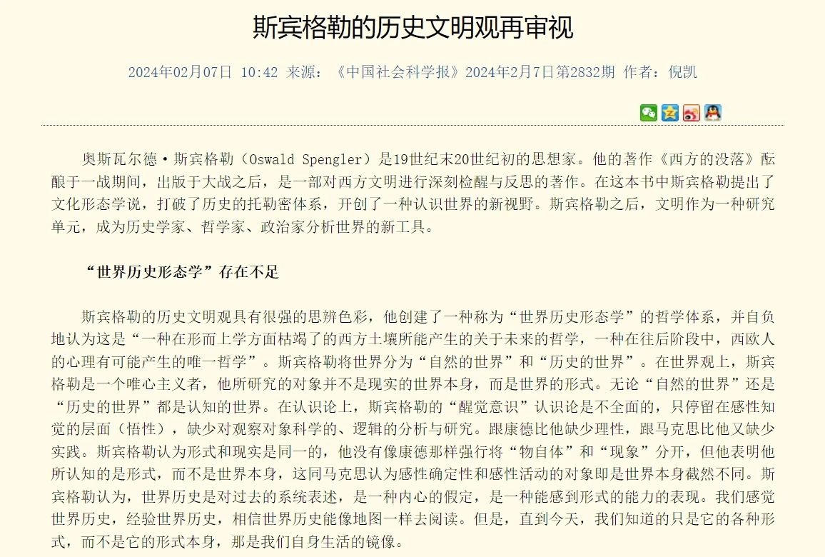 斯宾格勒的历史文明观再审视 奥斯瓦尔德·斯宾格勒(Oswald Spengler)是19世纪末20世纪初的思想家。他的著作《西方的没落》酝酿于一战期间,出版于大战之后,是一部对西方文明进行深刻检醒与反思的著作。在这本书中斯宾格勒提出了文化形态学说,打破了历史的托勒密体系,开创了一种认识世界的新视野。斯宾格勒之后,文明作为一种研究单元,成为历史学家、哲学家、政治家分析世界的新工具。 “世界历史形态学”存在不足 斯宾格勒的历史文明观具有很强的思辨色彩,他创建了一种称为“世界历史形态学”的哲学体系,并自负地认为这是“一种在形而上学方面枯竭了的西方土壤所能产生的关于未来的哲学,一种在往后阶段中,西欧人的心理有可能产生的唯一哲学”。斯宾格勒将世界分为“自然的世界”和“历史的世界”。在世界观上,斯宾格勒是一个唯心主义者,他所研究的对象并不是现实的世界本身,而是世界的形式。无论“自然的世界”还是“历史的世界”都是认知的世界。在认识论上,斯宾格勒的“醒觉意识”认识论是不全面的,只停留在感性知觉的层面(悟性),缺少对观察对象科学的、逻辑的分析与研究。跟康德比他缺少理性,跟马克思比他又缺少实践。斯宾格勒认为形式和现实是同一的,他没有像康德那样强行将“物自体”和“现象”分开,但他表明他所认知的是形式,而不是世界本身,这同马克思认为感性确定性和感性活动的对象即是世界本身截然不同。斯宾格勒认为,世界历史是对过去的系统表述,是一种内心的假定,是一种能感到形式的能力的表现。我们感觉世界历史,经验世界历史,相信世界历史能像地图一样去阅读。但是,直到今天,我们知道的只是它的各种形式,而不是它的形式本身,那是我们自身生活的镜像。 斯宾格勒的历史哲学思想是浪漫主义的,源于费希特对康德思想的改编。斯宾格勒认为,现实生活、历史只知道事实,并没有真理。他以“有机体”的观念取代了机械的因果观念;以生长的观念取代了历史进步的观念,用一种经验的必然取代了一种逻辑的必然。这种基于生命哲学的有机论和宿命论,是非理性的,最终将斯宾格勒引向了神秘主义与相对主义。斯宾格勒声称自己的哲学得益于歌德和尼采,尤其采用了歌德的方成与已成概念,但歌德的方成与已成概念强调事物的生成变化,具有朴素的辩证法视野。斯宾格勒将生成与已成的应用于“历史的世界”的文化向“自然的世界”的文明的发展过程,但是他认为文化发展到文明的已成阶段会失去生命力,走向没落。马克思和恩格斯同样将“生成”与“已成”应用于对世界发展的描述,但是马克思和恩格斯将生成与已成置于一种辩证发展的视野中。马克思、恩格斯认为对于辩证哲学来说,没有事物是终结、绝对与神圣的。它揭示了事物与事物内部的短时特征,除了连续不断的生成与过去的过程,除了无休止的由低级到高级的上升,没有事物在辩证法面前可以长久。 突破“西方中心论”的尝试与失误 斯宾格勒认为,过去的哲学几乎都以“自然世界”为对象,而他要审视“历史的世界”,审视那作为生命载体的活生生的世界。活生生的世界并不是统一的,而是因生活在其中的人的世界感(心灵)分成了不同的文化(形态),每种文化自成一个“历史的世界”。斯宾格勒观察到世界上存在有八种高级文化形态:埃及文化、巴比伦文化、印度文化、中国文化、古典文化、阿拉伯文化、西方文化和墨西哥文化。斯宾格勒认为,全人类的历史是不存在的,存在的只是各个文化的历史。他试图突破“欧洲中心论”的历史书写模式,撰写一部人类文明的世界史。斯宾格勒指出,西方的传统史学书写,总是把西方文化作为一个极,其他文化被迫谦逊地围绕着这个极在旋转,他称这种历史叙事是历史的托勒密体系。斯宾格勒试图打破这种以西方为中心的历史书写,他把印度文化、巴比伦文化、中国文化、阿拉伯文化、埃及文化、墨西哥文化等诸文化看作与古典文化/西方文化地位相同的世界景象,力图书写由各个文化组成的世界历史,他称这种以文化为单元构筑的历史叙事为历史领域的哥白尼发现。 斯宾格勒的历史文明观,尤其是文明衰退论,在世界上引起了强烈的反响。按照斯宾格勒文化、文明发展的有机必然性和宿命必然性理论,所有的文明终将走向没落。他之所以会提出文明衰落的观点,与对资本主义工业文明的失望态度有关。斯宾格勒的整个思想体系都充斥着对现代文明的抵触,充斥着一种悲观的色调,他强调当下(生活)是比较形态学的坐标,而他眼中的当代资本主义世界是理智的、物欲的、机械的,贵族消失、污染严重、充斥着战争阴霾。由此他回望中世纪生活的恬静与美好(文化阶段),这种浓重的怀乡情节源于时间的距离感产生的美好想象,而现实却是大国扩张给他带来的那种压迫感与紧张感。斯宾格勒在讨论第一次世界大战爆发的原因时指出,文明发展的最后阶段即是凯撒主义或帝国主义的,基于这种设定,他解释了第一次世界大战爆发的必然性(文明发展到成熟阶段扩张的必然性)。他说正在迫近的大战是在定限范围内的一个巨大历史有机体中在几百年前就已注定了的转折点上所发生的。 文明真的会遵循斯宾格勒生命有机体的方向最终走向消亡吗?另一位文化形态史学家汤因比的文明周期论或许