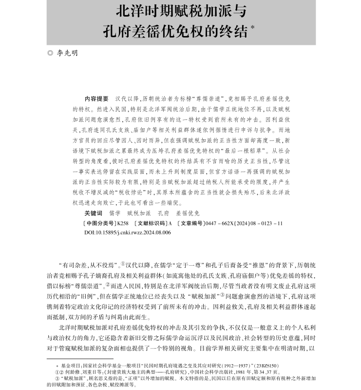 《北洋时期赋税加派与孔府差徭优免权的终结》 作者:李先明 内容提要:汉代以降,历朝统治者为标榜“ 尊儒崇道”,竞相赐予孔府差徭优免的特权。然进入民国,特别是北洋军阀统治后期,由于儒学正统地位不再,以及赋税加派问题愈演愈烈,孔府依旧例享有的这一特权受到前所未有的冲击。因利益攸关,孔府连同孔氏支族、庙佃户等相关利益群体遂依例据情进行申诉与抗争。而地方官员的回应尽管因人、因时而异,但在强调赋税加派的正当性方面却高度一致,新语境下赋税加派之累最终成为压垮孔府差徭优免特权的“ 最后一根稻草”。 从社会转型的角度看,彼时孔府差徭优免特权的终结具有不言而喻的历史正当性,尽管这一事实表达停留在实践层面,而未上升到制度层面,但官方话语一再强调的赋税加派的正当性实际较为有限,特别是当赋税加派超过纳税人所能承受的限度,并产生税收不增反减的“ 税收悖论” 时,其原本所蕴含的正当性就会损失殆尽,后来北洋政权迅速走向败亡,于此也可看出一些端倪。 关键词:儒学;赋税加派;孔府;差徭优免 该刊发于《人文杂志》2024年第8期