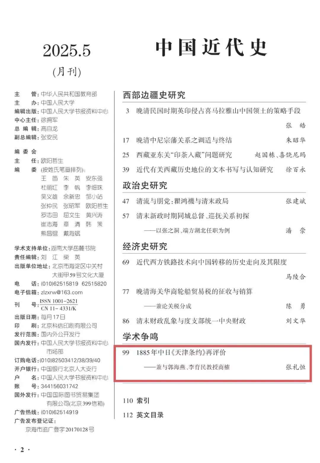张礼恒教授发表于《历史教学问题》2025年第1期的论文《1885年中日〈天津条约〉再评价——兼与郭海燕、李育民教授商榷》,被中国人民大学《复印报刊资料·中国近代史》2025年第5期全文转载。文章指出,1885年4月签订的《天津条约》是日本对华外交的一次胜利,清政府毕竟在军事领域作出了让步,日本据此实现了军事层面与中国在朝鲜地位的对等。但是,对于《天津条约》有关“撤兵”、“派兵”的规定决不能过分引申、过度解读,因为它充其量就是中日两国为避免冲突升级、战争爆发而达成的一份军事停战协议、一纸书面照会形式,并使中日战争的爆发迟滞了10年之久。条约签订后,既没有形成朝鲜为中日两属之国的状态,日本也没有坠入“属邦论”的陷阱,中朝宗藩关系并没有因此而崩溃,反而得到了空前的加强。 1885年中日《天津条约》再评价——兼与郭海燕、李育民教授商榷 人大复印报刊资料是中国人文社科领域极具影响力和核心竞争力的二次文献期刊门类。中国人民大学复印报刊资料转载论文是从国内公开出版的6000多种专业特色报刊中精选出的社科研究成果,是评价人文社会科学期刊学术影响和人文社会科学研究成果水平的重要参考依据。小妲己直播