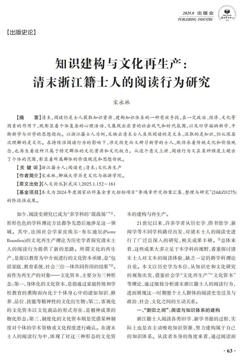 教师宋永林发表于《人文论丛》2025年第一辑的论文《知识建构与文化再生产:清末浙江籍士人的阅读行为研究》被中国人民大学《复印报刊资料·出版业》2025年第8期全文转载。 文章指出,清末,阅读仍是士人获取知识资源、建构知识体系的一种有效手段,在一定政治、经济、文化等因素的作用下,既彰显着个体复杂的心理活动,又展现出浓重的社会风气和时代氛围,以及旧学接纳新学、平衡新学与旧学的思想趋向。以浙江籍士人为例,反映出清末士人虽然阅读的是文本,汲取的是知识,但从深层次理解的是文化。在持续性阅读行为的影响下,涉足经史而又研习新学的士人,既传承着传统文化和价值观念,也再生着这种只属于特定群体的文化资源和文化权力。从这个意义上讲,阅读行为又在某种程度上超出了个体范围,彰显着所属群体的价值规范和思想传统。 人大复印报刊资料是中国人文社科领域极具影响力和核心竞争力的二次文献期刊门类。中国人民大学复印报刊资料转载论文是从国内公开出版的6000多种专业特色报刊中精选出的社科研究成果,是评价人文社会科学期刊学术影响和人文社会科学研究成果水平的重要参考依据。小妲己直播