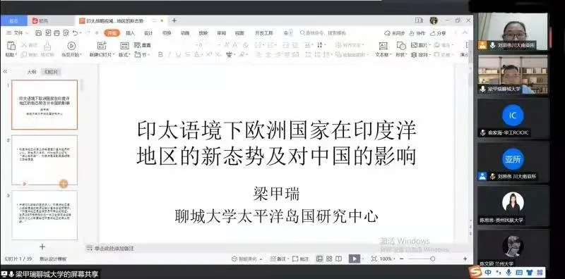 太平洋岛国研究中心研究员、学术研究部主任、海洋治理研究所所长梁甲瑞做了《印太语境下欧洲国家在印度洋地区的新态势及对中国的影响》的学术报告。他首先从印太语境下,探讨了欧盟、德国、法国在印度洋地区的新态势,从海洋安全维度和海洋健康维度,分析了其对中国连接印度洋地区蓝色经济通道的影响,并尝试提出中国构建连接印度洋地区蓝色经济通道的路径。