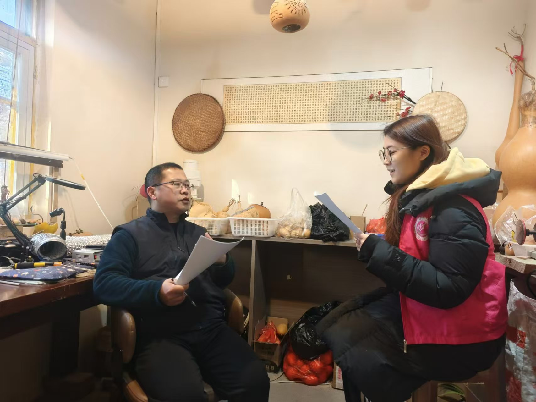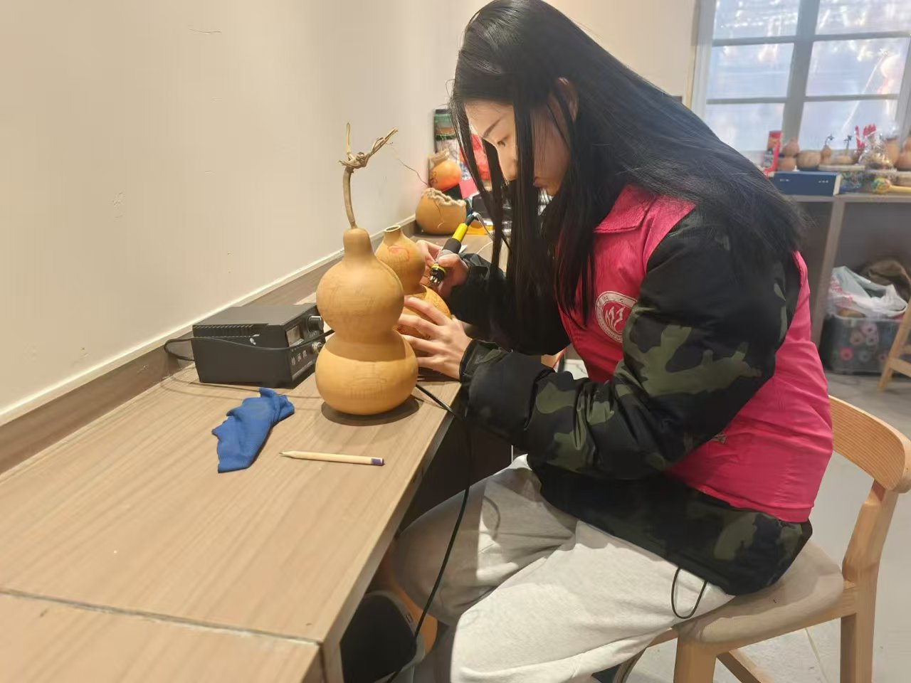 “探非遗珍萃,扬古韵新声”社会实践调研队于聊城道口铺新村举办“传承非遗文化,走进道口铺新村”活动。 志愿者通过海报,阐释道口铺新村木版年画和剪纸的历史渊源、文化内涵及传承脉络。志愿者带领群众亲身体验道口铺新村的剪纸文化,从简单到复杂的工艺制作,带领群众在实践中领略非遗技艺的精妙,感受到剪纸艺术的魅力,了解非遗文化在传播过程中所面临的问题。群众就活动主题积极思考,提出相关问题。志愿者详细讲解,加深群众对剪纸发展现状的了解。 本次活动的顺利举办,不仅有利于拓宽群众的文化视野,还有助于保护和传承道口铺新村的非遗文化,让更多的人关注非遗,增强当地的文化凝聚力和向心力。 非遗葫芦传古韵 文化传承谱新章 为加深群众对聊城本土非遗文化的了解与认同,吸引更多群众关注和支持非遗文化的传承事业,近日,小妲己直播