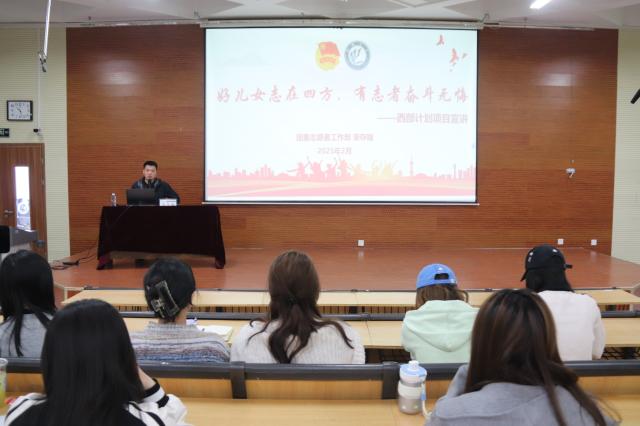 为积极响应国家号召,扎实推进大学生志愿服务西部计划宣传工作,引导同学们积极投身基层,建设美丽西部,3月22日,我院于6#A106教室举办2025年西部计划宣讲会。本次宣讲会由校西部计划项目办、校团委志愿工作部部长荣存福担任主讲人,我院团委书记石晓晗及2021级应届毕业生参加会议。 荣存福紧扣“奉献、友爱、互助、进步”的志愿精神展开系统解读,详细阐释西部计划的中央与地方财政协同保障机制——志愿者在岗期间将享受社会保险全覆盖、住宿交通补贴等支持,服务期满后还可申请学费补偿或助学贷款代偿。同时,他以我校优秀志愿者事迹为例,生动展现西部计划的实践价值。荣存福建议同学们登录全国西部计划官网完成预报名,并承诺校项目办将提供“全流程”指导,包括政策咨询、技能培训及岗前实训。他鼓励同学们用一年的时间,做一件终生难忘的事,用行动证明“西部的广阔天地是青年成长的沃土,基层的奋斗足迹是青春最美的勋章”。 本次活动的顺利举办,使同学们了解到西部计划的内容与政策,有利于激发同学们服务西部、建设祖国的热情,推动更多青年将个人理想融入国家发展大局,在服务西部的实践中书写无悔青春。 (供稿:罗佩华 摄影:罗佩华 初审:于舒然 复审:张程程 终审:尤姗姗)