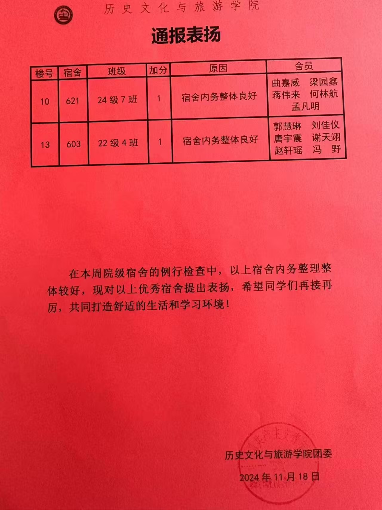 于群星公寓开展“十佳寝室”评比活动。 本次宿舍评比活动的顺利进行,不仅有利于促进同学们养成良好的生活习惯,更有利于增强同学们的集体荣誉感和归属感,营造一个整洁、美观的宿舍环境。 (供稿:崔汉卿 初审:裴一玮 复审:李月 终审:尤姗姗)