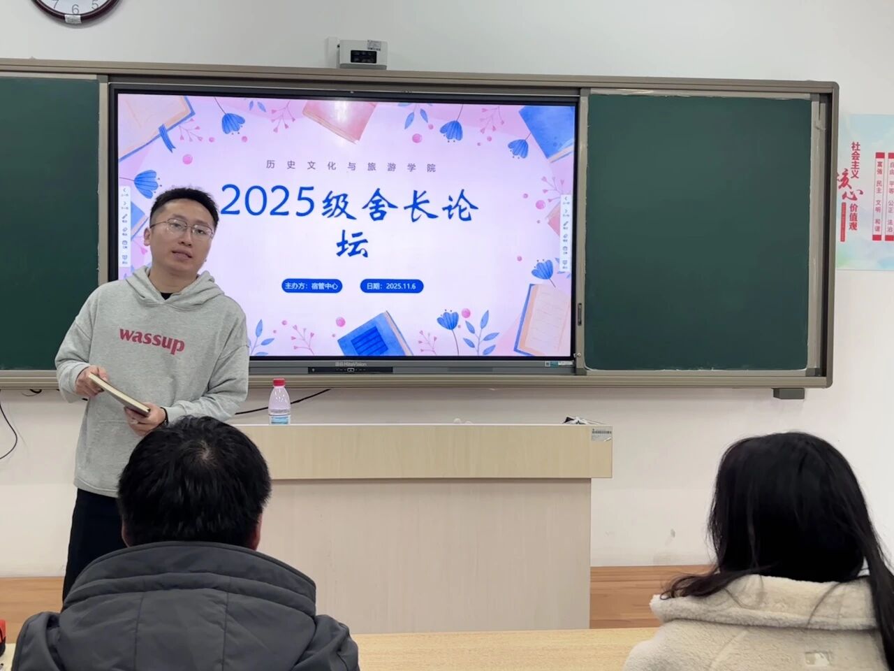 于6#A305教室举办2025级舍长论坛会。学院辅导员王旭辉、2025级宿舍长参加本次论坛会。 王旭辉从宿舍建设角度出发,为舍长提供实用的宿舍管理建议和方法。他指出,宿舍是一个集体,舍长应当发挥桥梁纽带的作用,主动协调室友之间的关系,增强宿舍的凝聚力和向心力。在宿舍安全和卫生方面,王旭辉详细介绍宿舍卫生检查细则,重点强调用电安全规范与违禁品管控要求,并针对宿舍长提出的疑问进行现场解答,提供切实可行的解决方案。 宿管中心负责人详细介绍宿舍管理的各项规章制度,包括宿舍检查细则,违纪处理,消防安全注意事项等多个方面,具体全面地帮助宿舍长理清宿舍检查内容及执行标准。同时,她积极回应舍长诉求,强调遵守规章制度的重要性,并呼吁舍长以身作则,营造有序安全温馨的宿舍环境。 论坛会结束后,2025级宿舍长纷纷表示,此次舍长论坛会为自己日后管理宿舍明晰方向,进一步强化集体意识,未来将以实际行动构建温馨和谐的宿舍氛围。 本次舍长论坛会的顺利举办,不仅有利于切实解决学生在作息协调、卫生维护、矛盾化解等方面的困扰,使其拥有更和谐舒适的宿舍生活环境,而且有利于培养学生的自律意识与责任意识,为新学期宿舍管理工作的有序开展奠定基础。 (供稿:周琦鑫 张诺 陆雅馨 摄影:张诺 陆雅馨 初审:陆雅馨 复审:宋佳珊 终审:尤姗姗)