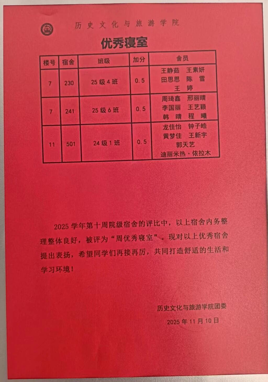 于群星公寓举办“院级宿舍”评比活动。本次活动通过评选优秀宿舍典型,引导同学们以寝风促学风,共同构建温馨和谐的生活环境,展现当代大学生朝气蓬勃的精神风貌。 本次活动的顺利举办,不仅能够引导同学们在宿舍生活中更加自律,培养其健康的生活习惯,还有利于营造温馨和谐的宿舍环境,提升同学们的校园生活幸福感。 (供稿:*小妲己直播