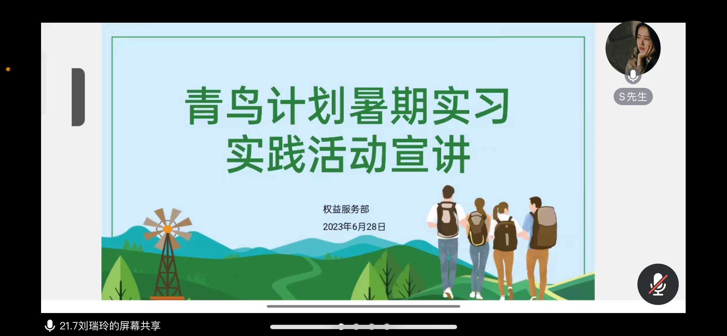 开展2023年暑期“青鸟计划”线上推进会。本次会议邀请团委书记石晓晗参加,2021级、2022级学生进行线上聆听。 推进会上,石晓晗着重向同学们讲解了“青鸟计划”实习实践活动的意义,“青鸟计划”起到了助力青年学子感知家乡、了解社会、提升技能的作用,在增加大学生社会经验的同时,激发青年学子返乡发展的积极性和主动性,促进青年人才回归家乡创业就业。随后,主持人向参会同学分享以往参与“青鸟计划”实习实践同学的经历与感悟。他们提到,青鸟计划的实习活动让假期有了不同寻常的意义,大家可以在青鸟计划实践中了解社会、开阔视野、增长见识。在答疑环节中,结合同学们提出的疑惑与困扰,主持人重点向大家介绍了部分岗位的具体工作内容,并鼓励大家积极参与其中。活动最后,主持人建议同学们关注家乡所在地的省、市、县区的共青团组织微信公众号,阅读“青鸟计划”系列推文,抓住实习机会,用实践回报家乡。 本次“青鸟计划”线上推进会为同学们搭建了信息交流平台,进一步提高了大家对“青鸟计划”的认识和了解,同时,也能够鼓励更多的优秀大学生助力家乡发展,以青春之我成就青春之家乡。 (图文:孙玥 初审:常天阳 复审:和稀如 终审:石晓晗 辛超)