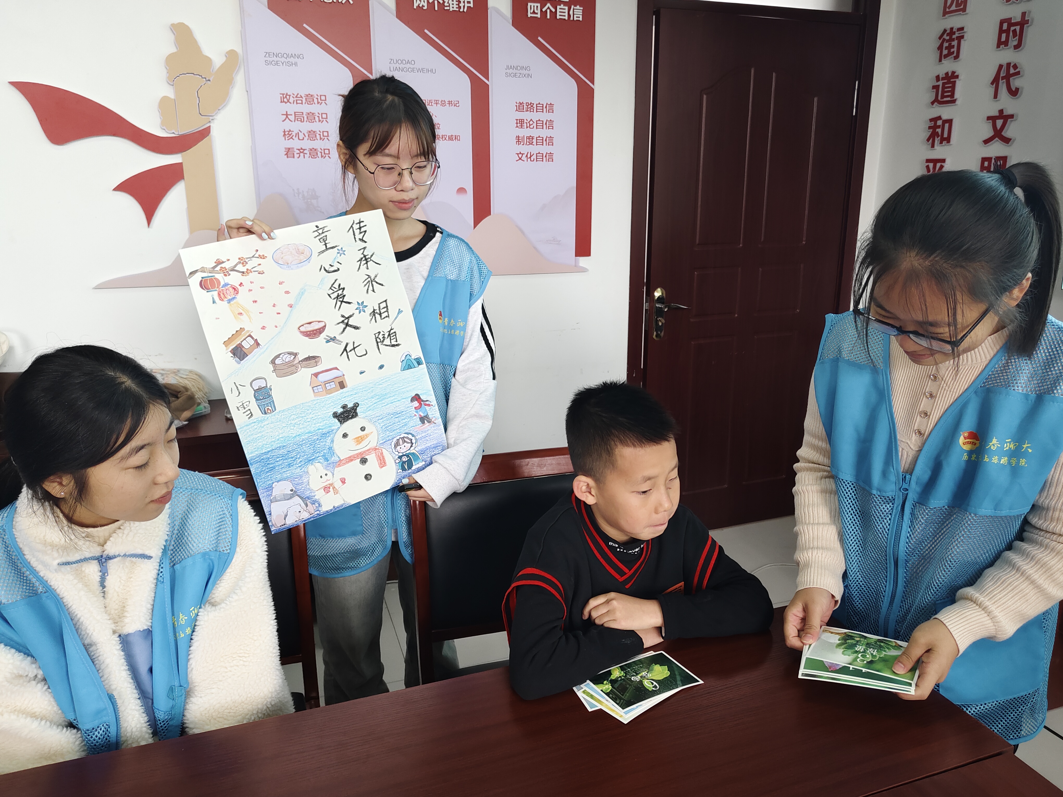 于聊城市和平社区举办“童心向文化,传承永相随”传统文化主题活动。 活动伊始,志愿者结合PPT以生动形象的语言为孩子们讲解二十四节气的基本知识,包括节气简介、节气习俗、节气特点等等。在志愿者的引导下,孩子们积极参与课堂互动,主动学习二十四节气的相关知识。讲解完知识后,志愿者组织孩子们进入“击鼓传花”答题环节,加深了孩子们对节气知识的理解。随后,志愿者借助精美的展板向孩子们进一步介绍二十四节气的物候特征和民间习俗,将传统习俗与传统节气相结合,探究二十四节气的来源和意义。最后,志愿者向孩子们发放写有爱心寄语的二十四节气主题明信片。五颜六色的明信片,寄托了志愿者对孩子们健康成长的期盼,更在孩子们的内心根植下文化相传的种子,激发他们对于中华优秀传统文化的继承和探索之心。 本次活动的顺利举办,不仅有利于加深孩子们对节气相关历史知识和民俗习惯的了解,在切身体验中感受传统文化的魅力,同时也有利于引导孩子们在潜移默化中接受中华传统文化的熏陶,传承中华优秀传统文化,增进青少年对传统文化的认同感和自豪感。 (供稿:杨春雨 摄影:黄睿贤 李想 初审:岳珍珠 复审:祝豪泽 终审:尤姗姗)
