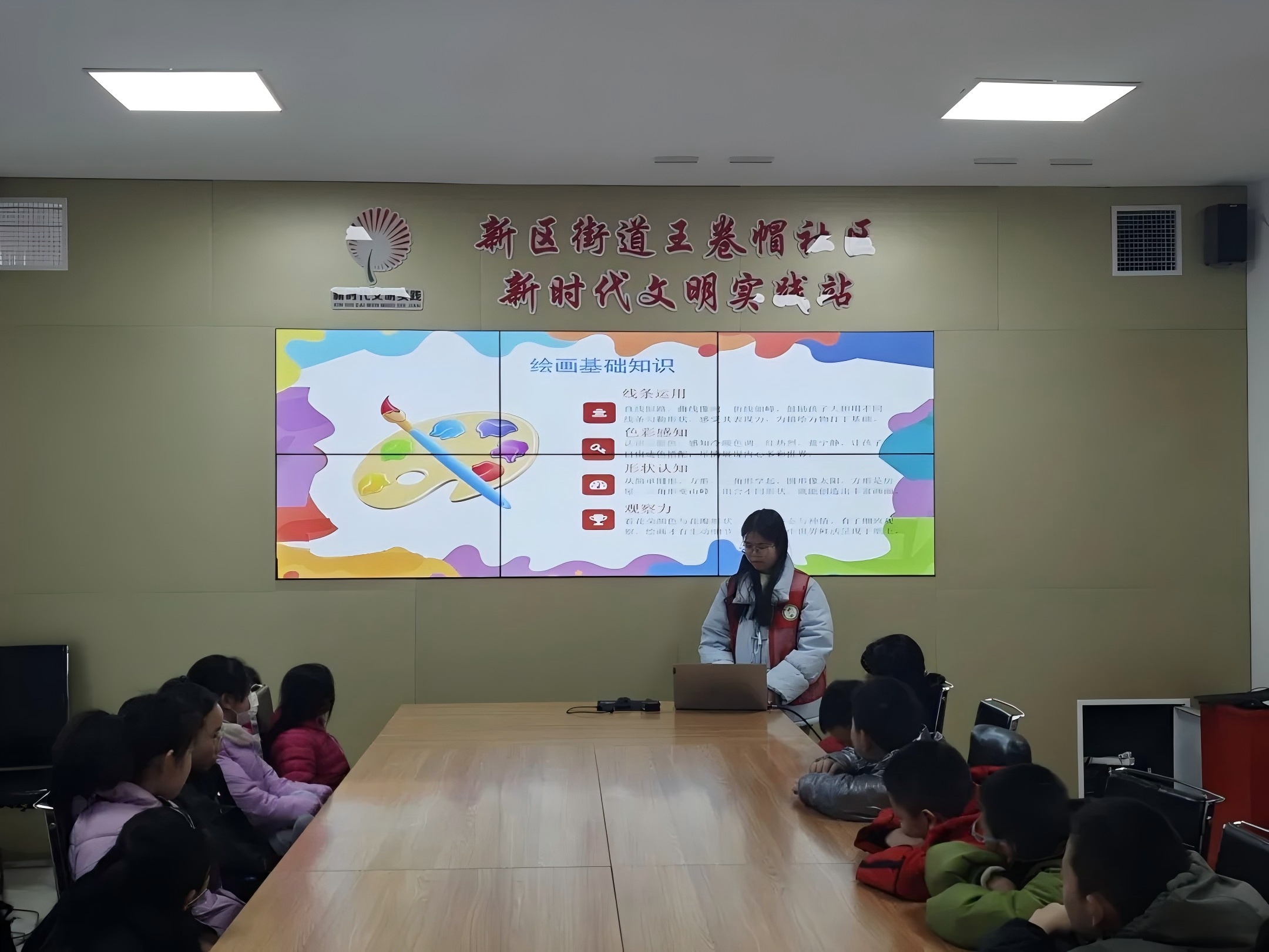 “逐光而行,艺彩绽放”志愿宣讲团于王卷帽社区开展“翰墨丹青,墨画传情”社区志愿活动。 志愿者借助 PPT 生动形象地向小朋友们阐述中国绘画从诞生到逐步完善的发展历程。从原始绘画的质朴到宋元明清的多元创新与近现代的融合突破,都详细地展现在小朋友们眼前。在互动环节中,志愿者就绘画作品中的色彩运用提出问题,小朋友们踊跃举手回答,现场气氛热烈,充满欢声笑语。 紧张刺激又趣味十足的分组有奖答题环节,题目围绕中国绘画知识精心设计,涵盖绘画历史、流派风格、技法特点等多个方面。在志愿者的有序组织下,小朋友们分成多个小组,积极答题,在答题过程中小朋友们收获了更多关于中国绘画的知识。志愿者呼吁小朋友们要深入探索中国绘画的独特韵味,用心感受其中蕴含的深厚文化底蕴,从而不断增强对中华优秀传统文化的自豪感。 本次活动的顺利举办,不仅有利于小朋友们领略到中国绘画的魅力,点燃他们对绘画艺术的热爱之火,还有利于提升他们的艺术素养,为中华优秀传统文化的传承与发展注入蓬勃的新生力量。 (供稿:贾春雨 摄影:卓依婷 初审:于舒然 苏鑫超 复审:李月 终审:尤姗姗)