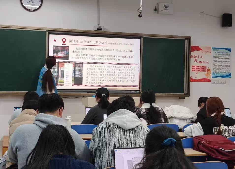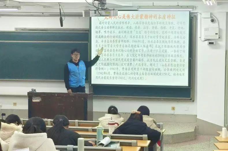 “史学不辍 沂蒙情长”志愿宣讲团之“高唱沂蒙颂歌,共赞巾帼风采”主题宣讲活动。 “蒙山高,沂水长,军民心向共产党。”一首《沂蒙颂》带着同学们的思绪穿越时空,来到革命年代的沂蒙山区。宣讲团成员以“水乳交融,生死与共”的沂蒙精神开篇,讲述“沂蒙红嫂”的英雄事迹。其中,聋哑母亲明德英用乳汁喂养在反“扫荡”突围中身负重伤、失血过多、脱水休克的八路军小战士,生动展现了“水乳交融”的真切含义,同学们也为沂蒙红嫂不畏牺牲、不畏强敌、不惧风险、甘于奉献的巾帼风采所深深打动。 “红布裹,青石藏,沂水养大的娃儿哟,踩着枣花儿回家乡……”宣讲员们通过视频再现“沂蒙山回荡着沂蒙母亲轻柔的歌声,一个个八路军后代和烈士遗孤在沂蒙母亲的怀抱里,在《拾婴谣》的歌声中进入梦乡,做着甜甜的梦……”的场景。在宣讲团成员深情地讲述中,同学们对沂蒙山区一位位巾帼英雄充满钦佩。同时,宣讲员以照片的形式带同学们云游王换于纪念馆,让同学们更深切地感受到沂蒙母亲的无私伟大。 “山河破碎飘摇处,沂蒙军民共甘苦。”这首《沂蒙精神耀中华》不仅歌颂蒙山和沂河的壮丽景色,还在字里行间赞颂沂蒙军民在抗日战争和解放战争中的英勇斗争。宣讲员强调,沂蒙山区的巾帼英雄不只是明德英、王换于等几位为人们所熟知的典型代表,沂蒙山的革命女性是群像,是一群热血而坚定的战士。同时,宣讲员分享了“沂蒙六姐妹”“女子火线桥”的革命故事,展现出巾帼风采。 “人人那个都说哎,沂蒙山好,沂蒙那个山上哎,好风光。”宣讲尾声,宣讲员们带领学生齐唱《沂蒙山小调》,这首民歌蜚声海内外,已成为沂蒙山区革命年代的符号。 这次“高唱沂蒙颂歌,共赞巾帼风采”系列主题宣讲活动获得同学们的强烈反响。宣讲团让沂蒙精神走进校园,让沂蒙红歌在校园中传唱,更让歌曲承载的革命信仰、巾帼英雄缩影和红色精神深植于学生心中。 (供稿:刘春萌 罗佩华 摄影:*小妲己直播