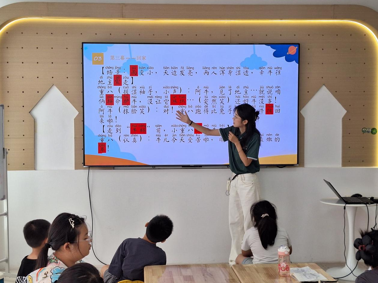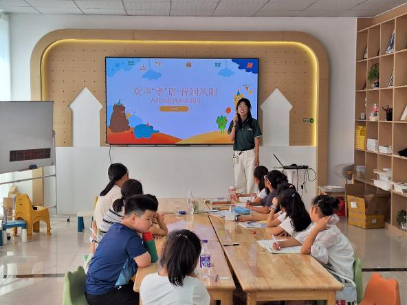 “欢声‘孝’语・普润凤阳”苔花筑梦推普志愿团于安徽省滁州市凤阳县如意社区第二课堂内创新推出“语言+艺术”沉浸式课堂,通过“少年剧演绎幼年朱元璋”“乡情画展绘凤阳”两大特色板块,将普通话推广与地域文化传承深度融合,为社区儿童带来了一场别开生面的文化盛宴。 在“凤阳少年剧”课堂中,志愿团队员们以朱元璋的童年故事为蓝本,将历史叙事转化为语言实践载体。其中,王普靖精心设计“放牛”“遇雨”“回家”三幕剧情,逐字标注“朱元璋”“凤阳”等关键词拼音,引导同学们在角色扮演中感受语言魅力。志愿者们分工明确, 就“雨”“家”等易混淆发音点,指导同学们反复跟读克服方言惯性。王普靖不时对同学们的标准发音给予肯定,在趣味演绎中强化了同学们普通话的运用能力。 “乡情艺术展”环节以凤阳文化地标为创作源泉,将语言学习融入艺术实践。队员陈宇浩以凤阳鼓楼、明皇陵、凤阳花鼓等为素材,现场示范“我画了明皇陵,这里的建筑很壮观”的普通话表达,并带领孩子们认读“陵”“鼓”等生僻字。同学们在志愿者们的指导下认读画中元素名称,激发了他们的创作与表达热情。 在自由创作阶段,同学们用彩笔勾勒出明中都古城墙、花鼓舞动的生动画面,画笔游走间自然习得“雄伟”“灵动”等形容词的标准发音。在展示环节中,同学们轮流介绍自己的作品,陈宇浩认真记录,对同学们讲“凤阳花鼓”时,“凤阳”发音标准给予肯定。活动尾声,一幅幅充满童趣的画作在社区长廊展出,借助艺术创作与讲解来推广普通话,成为推普成果的生动注脚。 本次活动的顺利举办,通过“历史剧+艺术展”的创新模式,让普通话学习从枯燥的拼音练习转变为沉浸式文化体验,既传承乡土文化,也为推普助力乡村文化振兴注入青春活力,推动普通话在乡村基层走深走实。未来,团队将继续探索“语言+非遗”“语言+文化”等多元模式,以青春之力推动普通话在乡村基层落地生根,为文化振兴注入源源不断的青春动能。 (供稿:韩明宇 王梦 摄影:*小妲己直播