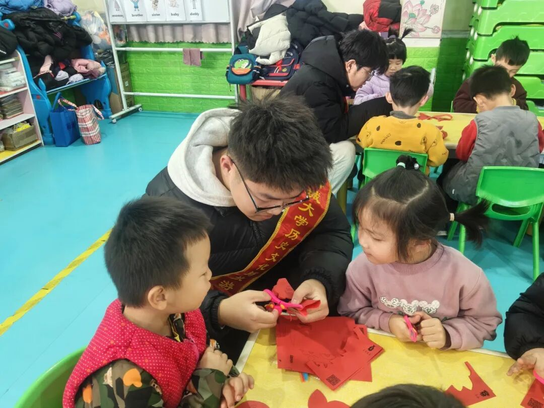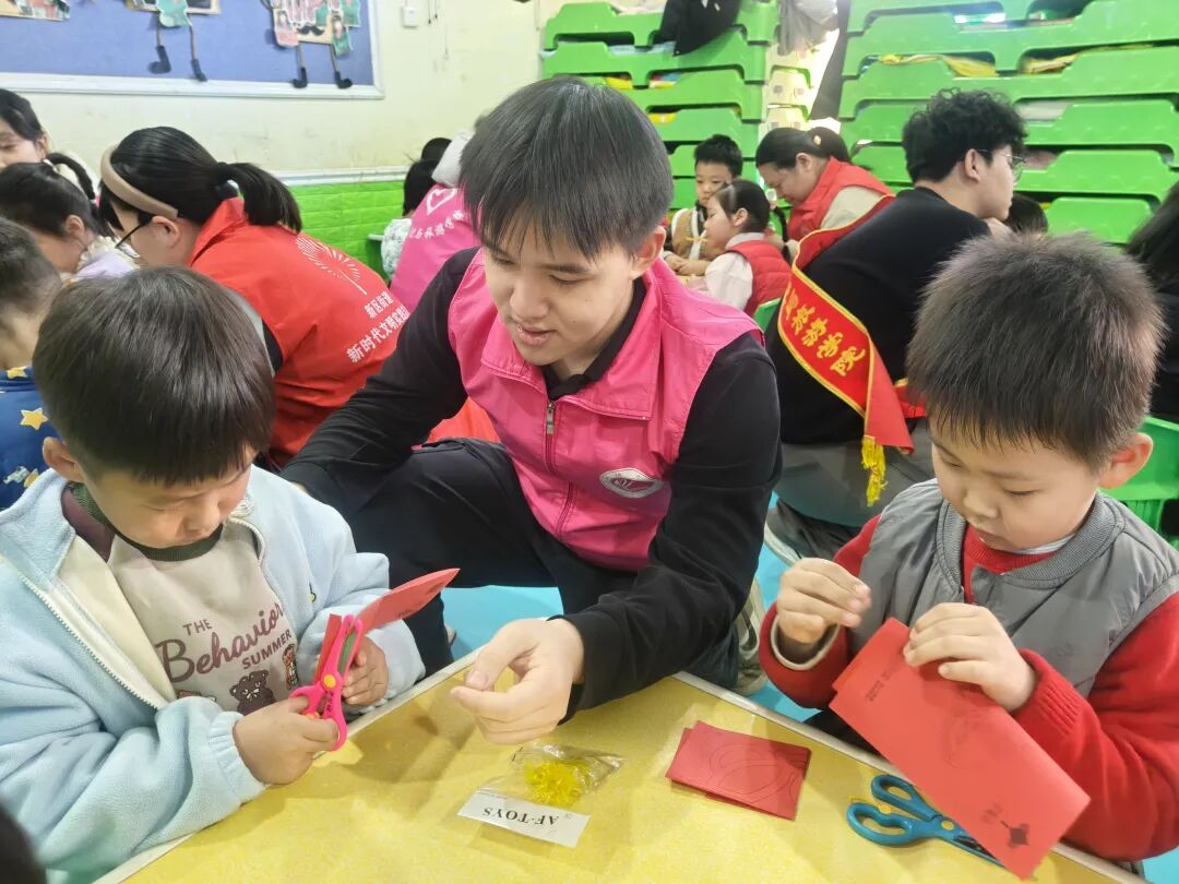 于聊城市新世纪社区举办“小手撕出新春福,暖暖心意绽暖阳”活动。 志愿者展示“福”字剪纸成品,讲述年俗小故事,吸引儿童聆听,引导儿童观察“福”字对称特点。志愿者对折红色彩纸,示范如何完成一个简单爱心。儿童学习志愿者教授的方法,志愿者俯身细致指导,耐心纠正儿童的手法,带领儿童沿虚线小心撕扯。儿童在志愿者协助下,共同拼组成一面五彩斑斓“百福墙”。实践结束后,每位儿童挑选一件最满意作品,由志愿者协助装入简易纸袋。活动氛围融洽,儿童专注的神情以及志愿者耐心引导的身影,交织成一道温暖画面。 本次活动的顺利举办,不仅有利于培养儿童的专注与耐心,而且有利于为社区注入童真乐趣与节日暖意,为构建温暖互助的社区环境贡献积极力量。 实践虽有终章,温情永不散场。愿这份从指尖流淌而出的春意,能化作社区长夜里的一盏灯,烟火日常里的一抹红。带着这份温度,我们将继续奔赴下一场山海,让青春在服务中绽放,让温暖在传递中永恒。 (初审:黄博雨 复审:魏志鹏 终审:尤姗姗)