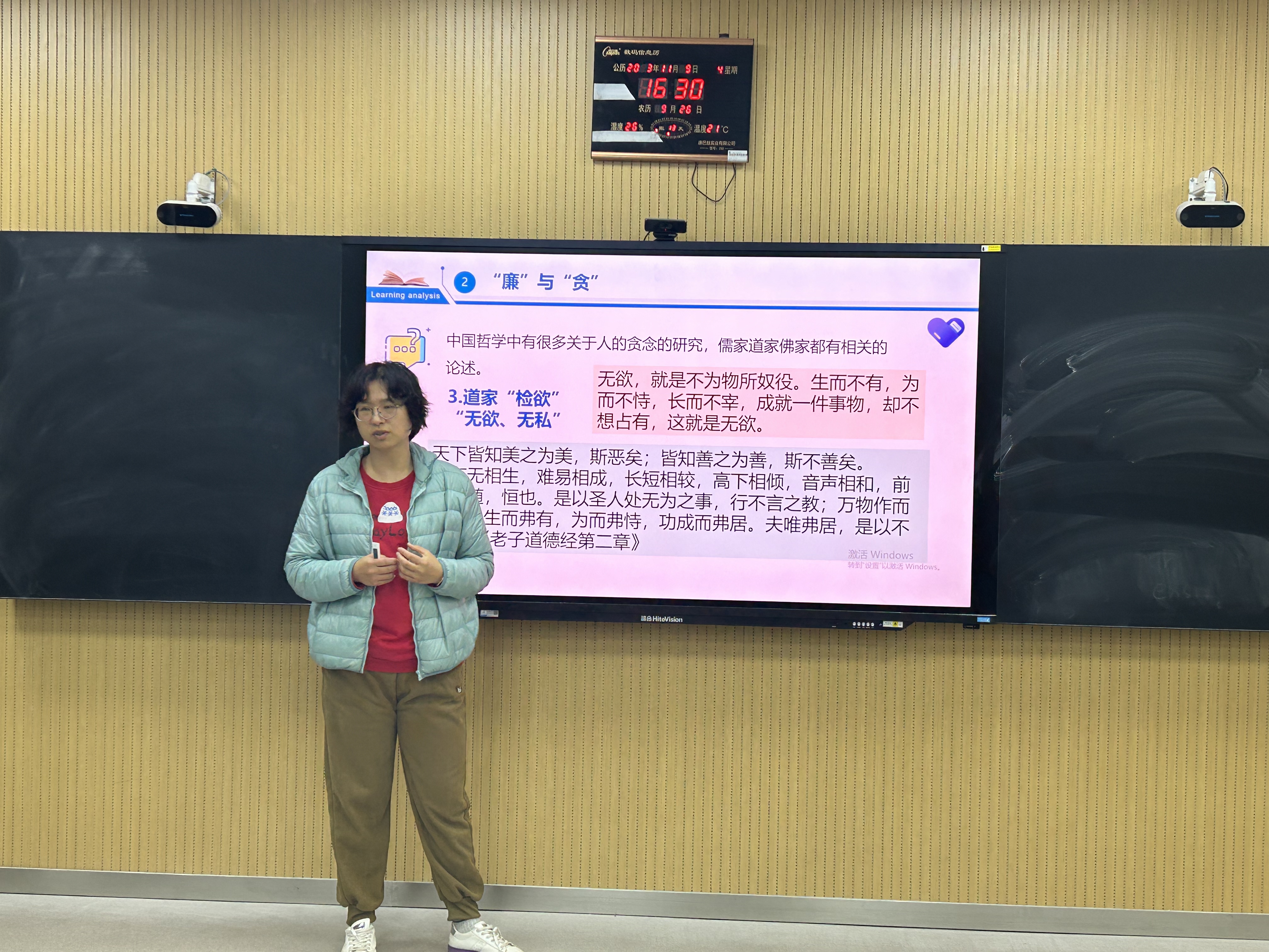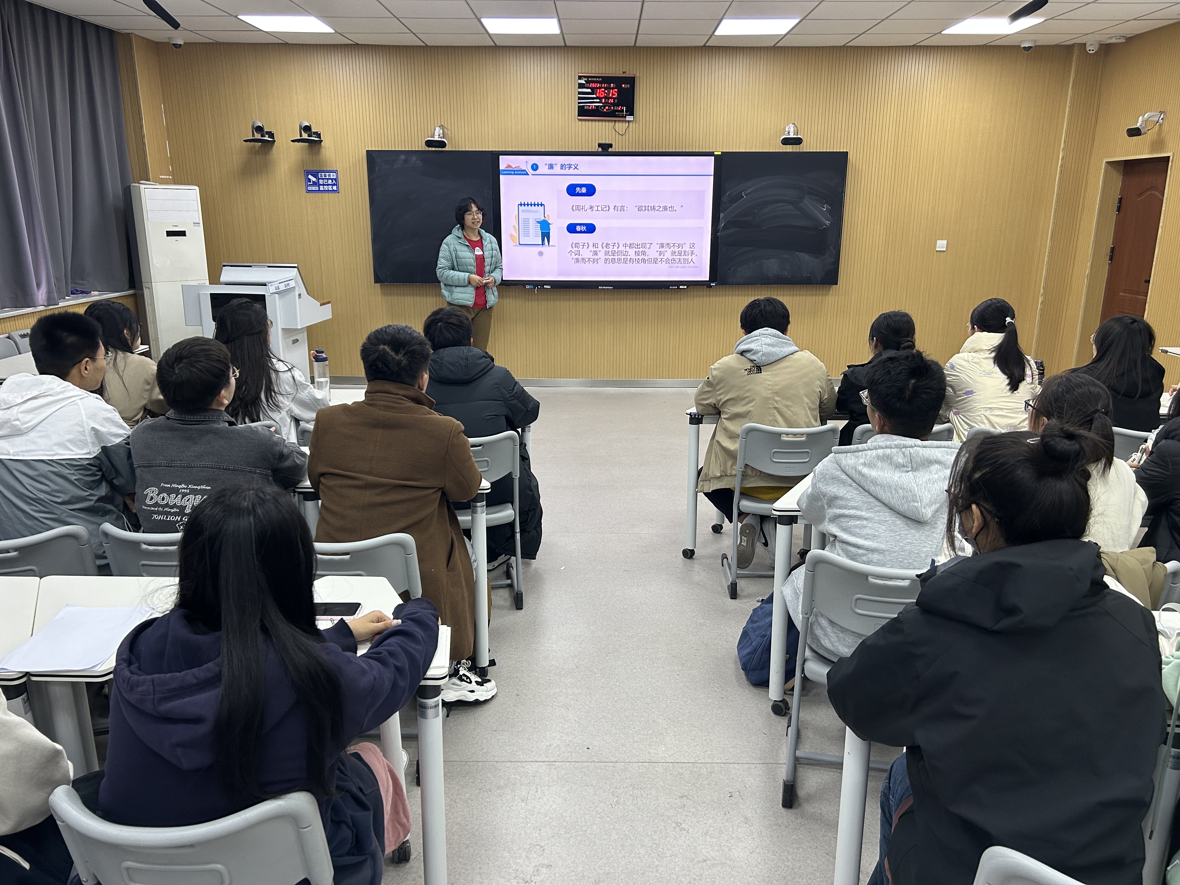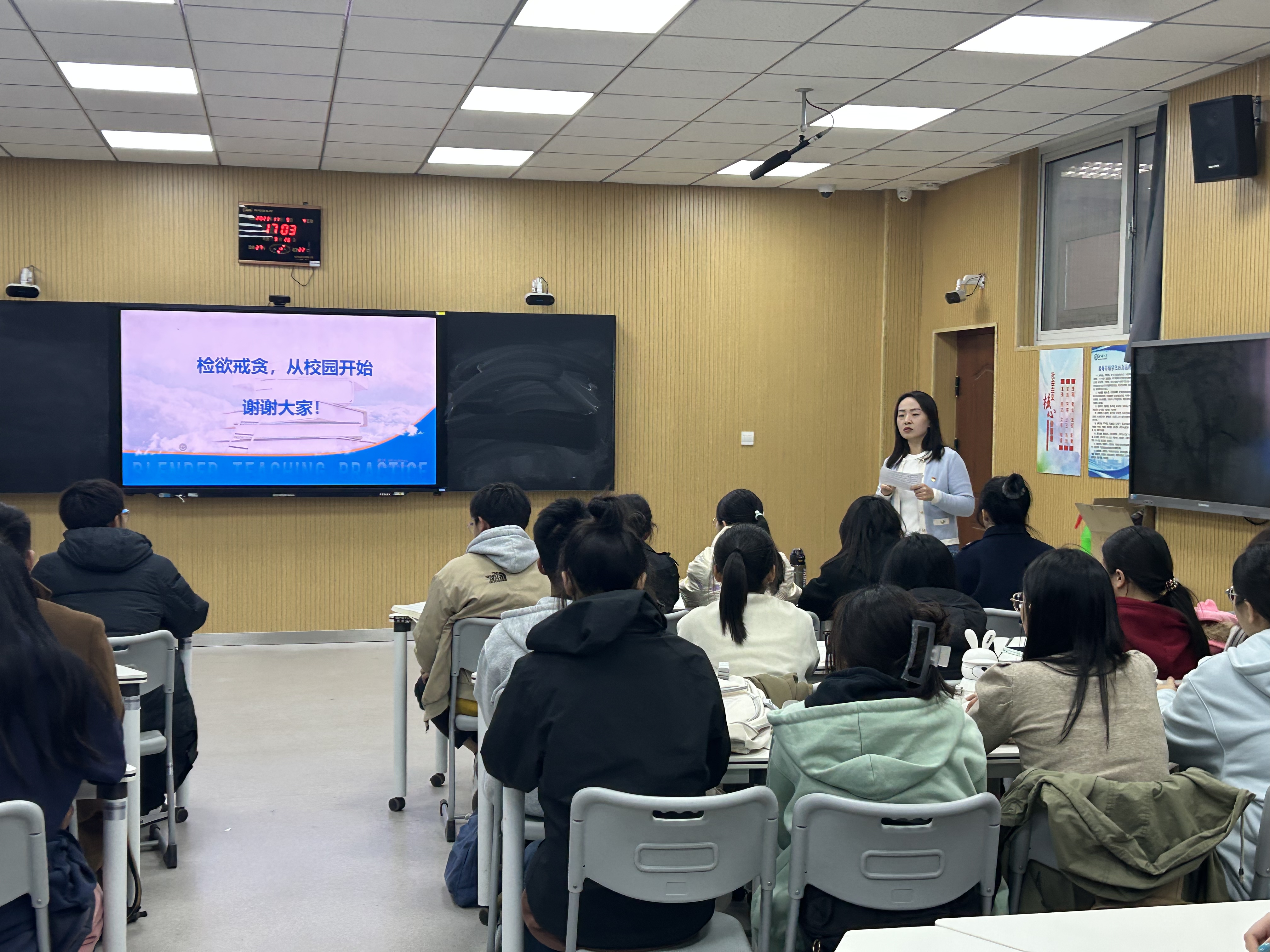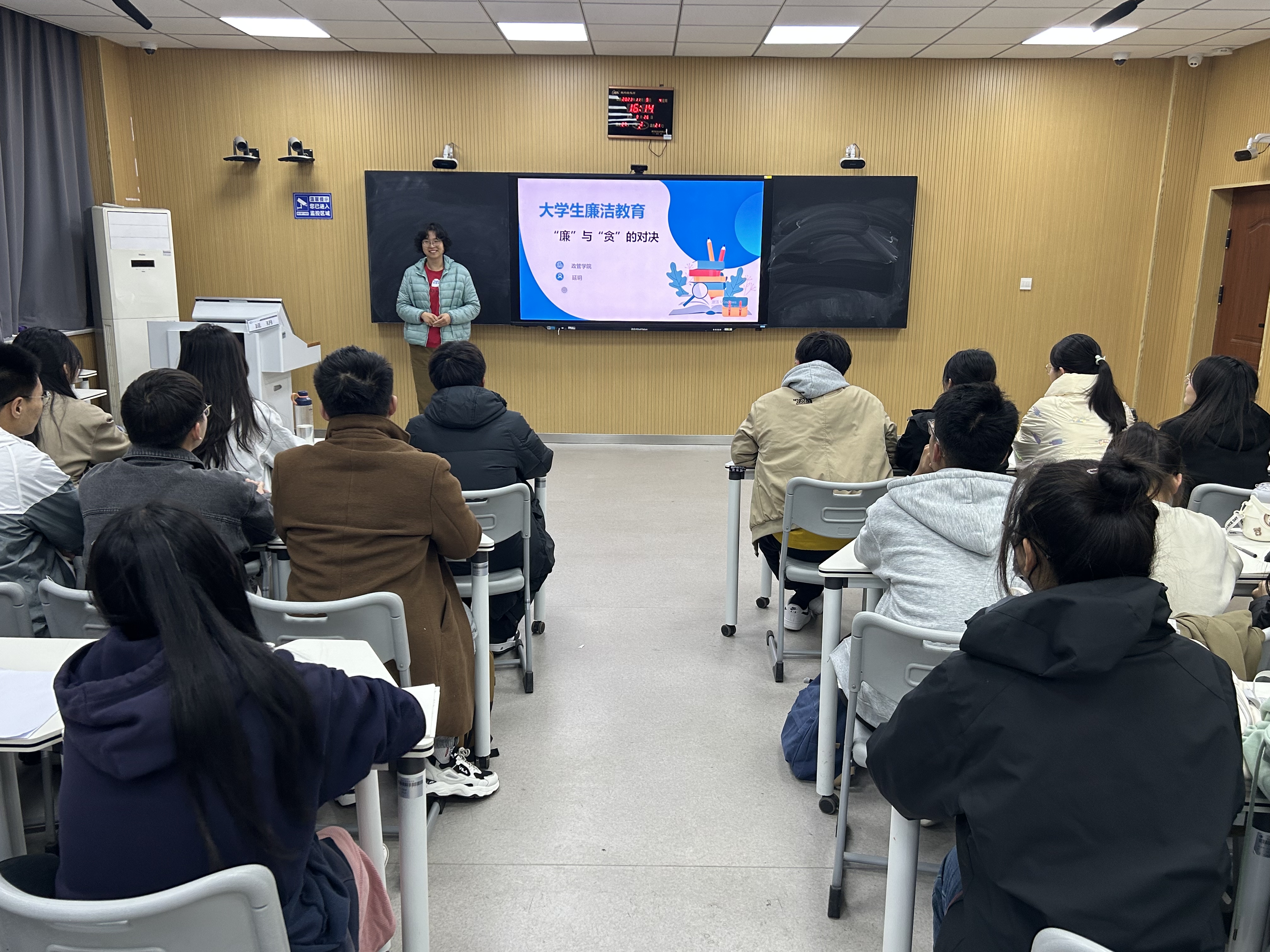 于6#A301教室开展廉洁文化教育主题讲座。本次主题教育讲座特邀政治与公共管理学院延玥老师主讲。 克己奉公、清廉自守是社会主义廉洁文化的核心价值,也是中华优秀传统文化的重要内容。会上,延玥老师分析《荀子•君道》中的名句,讲解古时贤人对“廉”“贪”的态度,并指出青年学生要常修为业之德,常思贪欲之害,常怀律己之心,时刻自重、自省、自警、自励,做到认知与行为统一。 随后,延玥老师通过具体案例向同学们讲述校园和社会中“贪”的危害,并警示在座同学坚守廉洁,切勿迷失自我。紧接着,延玥老师表示,作为学生干部应以身作则,争当廉洁自律的表率,以廉洁自律的作风影响和带动班集体,为廉洁校园的发展贡献自己的力量。 会议最后,石晓晗进行总结发言。她指出青年学生生在红旗下、长在春风里,务必以“廉”为荣,以“贪”为耻,并鼓励同学们公正做事、光明做人,以廉洁品格绽放青春光芒。 本次主题讲座的成功开展,不仅切实增强了青年学生的廉洁自律意识,提高了同学们对加强党风廉政建设重要性的认识,也进一步落实校园思想成长教育工作,推动廉洁教育常态化、长效化,为建设廉洁清正校园添砖加瓦。 (供稿:阿依布拉克·艾尼 摄影:庄欣彤 初审:庄欣彤 复审:祝豪泽 终审:尤姗姗)