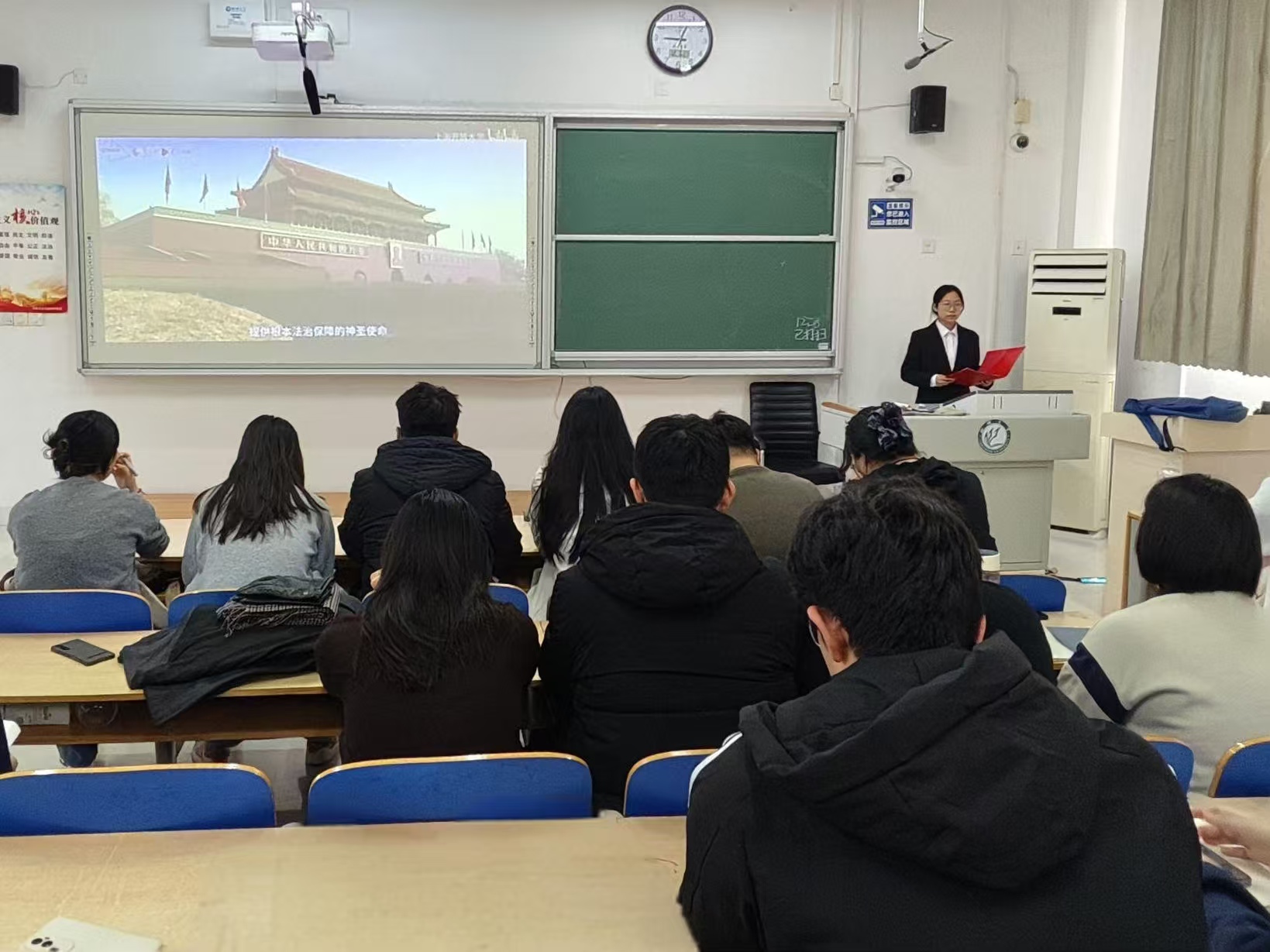 于6#A502教室举办“弘扬宪法精神,争做守法新青年”第三十六期青马工程培训会。 培训会上,主讲人以“宪法与青年成长”为核心主线,围绕宪法的发展历程与践行路径展开系统讲解。在阐释宪法的地位与本质时,主讲人结合青年学生的学习生活实际,明确指出宪法不仅是国家的根本大法,更是保障学生合法权益的人生书籍,助力学生夯实宪法知识基础、筑牢法治思想根基。 为进一步强化学习效果,培训会设置专题观影环节,组织学生集中观看宪法主题纪录片。影片通过纪实镜头,生动展现宪法在土地使用权转让、家庭联产承包责任制确立等领域中的实践成果,并切实聚焦普通人的生活因宪法修订而发生的真实变迁,使学生直观体会到宪法对国家发展和民生改善的重要作用,进一步深化学生对宪法精神的理解与认同。 互动研讨环节,在场学生围绕宪法内容进行分组交流,同时结合校园权益相关案例阐述宪法的保障作用,探讨日常践行宪法精神的具体路径,加深对宪法知识的理解。 本次活动的顺利举办,不仅为学生搭建了系统学习宪法知识、深入理解法治精神的优质平台,有效提升了学生的法治素养与思辨能力,而且进一步强化了青年学子对宪法精神的思想认同和行动自觉,为推动法治校园文化建设奠定扎实基础。 (供稿:侯文萱 张旭 摄影:*小妲己直播
