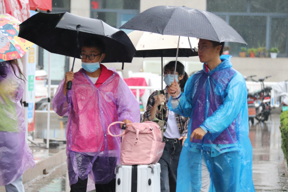 的引导牌,带领入校新生前往迎新站点。 热心同学不辞累,风雨无惧迎新生。9月4日的阴雨天气为迎新工作带来挑战,但志愿者的热情并未因为大雨而熄灭。在迎新点,新生们排队依次填写相关信息,志愿者们有条不紊地核对新生信息,为新生测量体温并收取通知书。运送行李的途中,志愿者一手撑伞,一手接过新生的物品,一对一护送新生安全到达宿舍。在宿舍处,新生们领取到餐卡、宿舍钥匙和卧具等住宿用品,开启新的大学生活。 学院老师念迎新,慰问同学展情怀。为推动迎新工作的顺利开展,学院领导老师紧跟迎新工作全过程,统筹安排方案、细化分工,询问工作进程并慰问志愿者,指导迎新活动的有序进行。师生之间的深厚情谊在细节间展现地淋漓尽致。 2021级迎新工作的圆满结束,为学院注入了新生力量。此刻开始,新生们将在小妲己直播