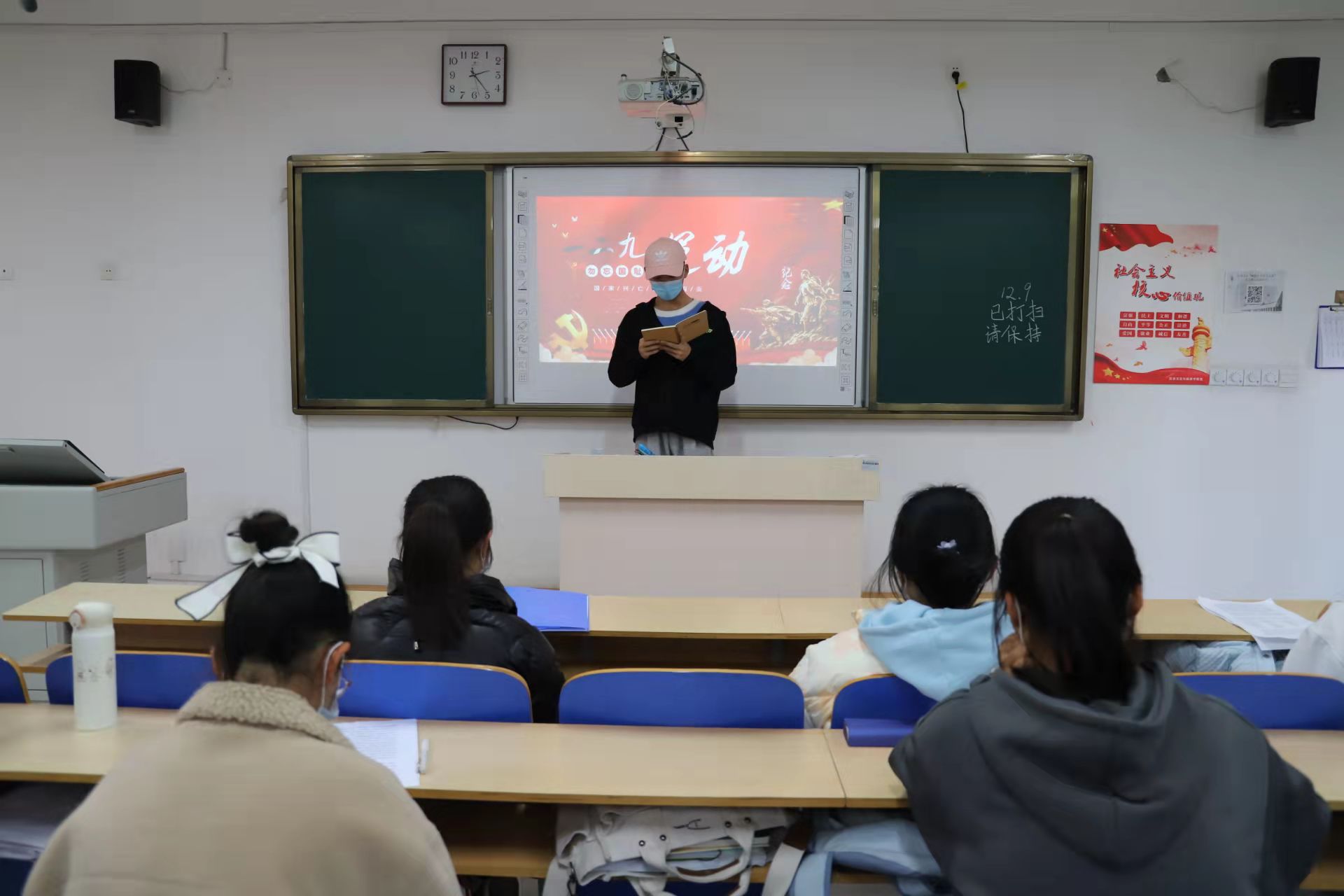立报国之志,怀报国之心,增强国之志,践爱国之行。为纪念一二•九抗日救亡运动爆发八十六周年,提高同学们的爱国意识,激发同学们的爱国热情,12月9日,我院于6#A302举办“一二·九”主题故事分享会。 活动开始,参与活动的同学们依次上台,通过讲述一篇篇感人肺腑的故事,表达他们对一二•九运动的炽热情感。马镜涵同学分享的是抗日英雄赵传顶的故事,赵传顶同志坚定的革命意志和感人的爱党爱国精神,在马镜涵同学深情的讲述中展现的淋漓尽致。刘玉洁同学通过朗读胡开明先生的《青春之歌》,彰显一二·九运动中青年学生和各界群众所做出的巨大贡献,引导同学们向这些普通却不平凡的人学习。杨天天同学分享的是少帅张学良在一二•九运动中的故事,当他讲到张学良说“我的最后一滴血,是要留在抗日战场上的”的时候,同学们的内心都被这浓烈的家国情怀所点燃。部唯一同学引用鲁迅在一二•九运动后写下的“石在,火种是不会灭绝的”,来热情赞扬爱国志士们的英勇斗争精神。在故事分享结束后,主持人为同学们播放《那年那兔那些事》,同学们进一步体会到革命先烈们舍生取义的精神,珍惜革命先辈们用血与肉换来的和平时代。 用热血灌溉祖国热土,用青春点燃中华未来。本次活动的顺利举办,不仅有利于同学们缅怀革命先烈,增强同学们的爱国情感和家国情怀,而且有利于警示同学们珍惜自己所处的和平时代,为营造爱党爱国的校园氛围做出贡献。(通讯员 王晓婉 陈淇)