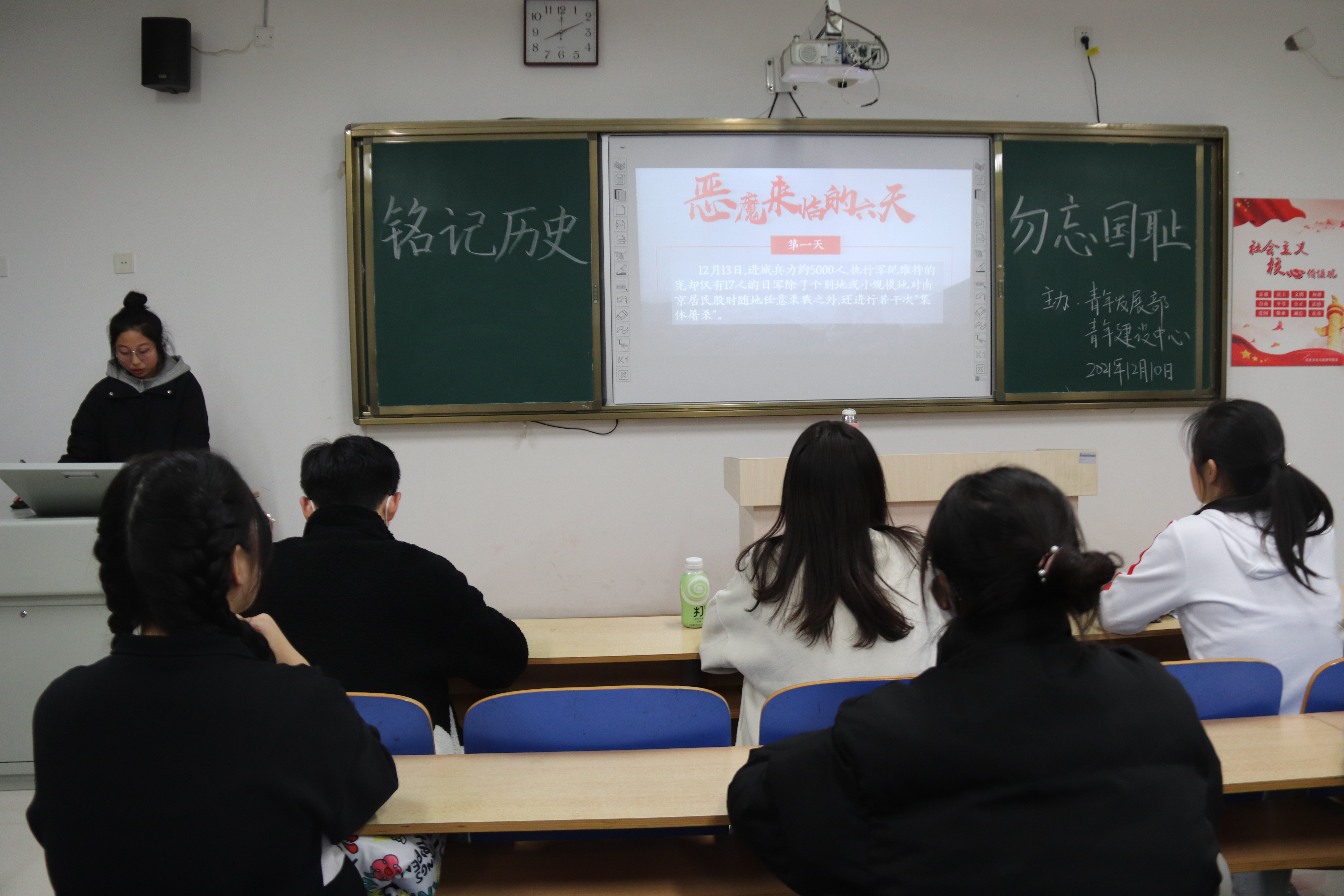 于6#A302教室举办“铭记历史,勿忘国耻”纪念活动。 本次活动共分为主题宣讲、观看影片和集体默哀三个部分。活动伊始,主持人简单介绍本次活动的目的并讲解活动流程。随后,宣讲人借助PPT来讲述南京大屠杀那段令人悲痛的历史,一张张骇人的照片披露出日本侵略者在南京犯下的滔天罪行,那段黑暗、血腥的历史也全面呈现在同学们的面前,宣讲人慷慨激昂地讲述,引发了同学们情感上的共鸣。接着,同学们共同观看有关南京大屠杀遇难同胞纪念馆的视频,视频里记录着84年前发生的那场惨案,腥风血雨中革命烈士英勇奋战,誓死保卫祖国的场景也都一一展现出来,同学们从中感悟到中国人民的革命抗争精神以及设立国家公祭日的目的意义。影片结束后,同学们纷纷表达自己对革命烈士的崇敬之情,并发出“铭记历史,勿忘国耻,吾辈当自强”的感叹。活动最后,同学们集体起立,为遇难同胞默哀三分钟,以表对他们英勇牺牲的敬意。 本次活动的举办,不仅有利于让同学们更加深入地了解历史,而且有利于让同学们将爱国热情内化于心,外化于行,以革命先辈为榜样,勇担青年使命,为中华民族的伟大复兴贡献自己的力量。(通讯员 和稀如 张婉婷)