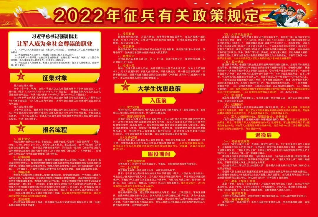 组织召开“大学生征兵宣传”主题班会,2020级全体学生参加。 征兵宣传册: 本次征兵宣传采取主题班会的形式,组织同学们观看2022年全国征兵公益宣传片,并向同学们讲述大学生应征入伍的条件标准、报名流程、优待政策、退役安置及相关具体政策,充分调动了同学们报名应征的积极性。 绿色的军营正向青年们张开双臂,呼唤着热血青年应征入伍、报效祖国、巩固国防!2022年征兵工作已全面启动,祖国召唤的号角已经吹响。在这质量建军、科技强军的年代,正需要你们这些有志参军报国的热血青年,积极投身国防实践,用热血青春肩负起时代赋予的重托,为建设我们的钢铁长城贡献青春力量。 有志青年立志从军,热血男儿精诚报国。广大青年学子要积极响应号召,到火热的军营中、到祖国最需要的地方去,携笔从戎保家卫国,献身国防助力强军,勇做新时代的奋进者、开拓者。作为新时代大学生,在祖国召唤我们的时候,我们要胸怀爱国之心、报国之志,听从祖国的召唤,接受祖国的挑选,热爱国防、关心国防、支持国防,勇于为祖国和人民撑起—片和平的蓝天。(通讯员 董楷文)