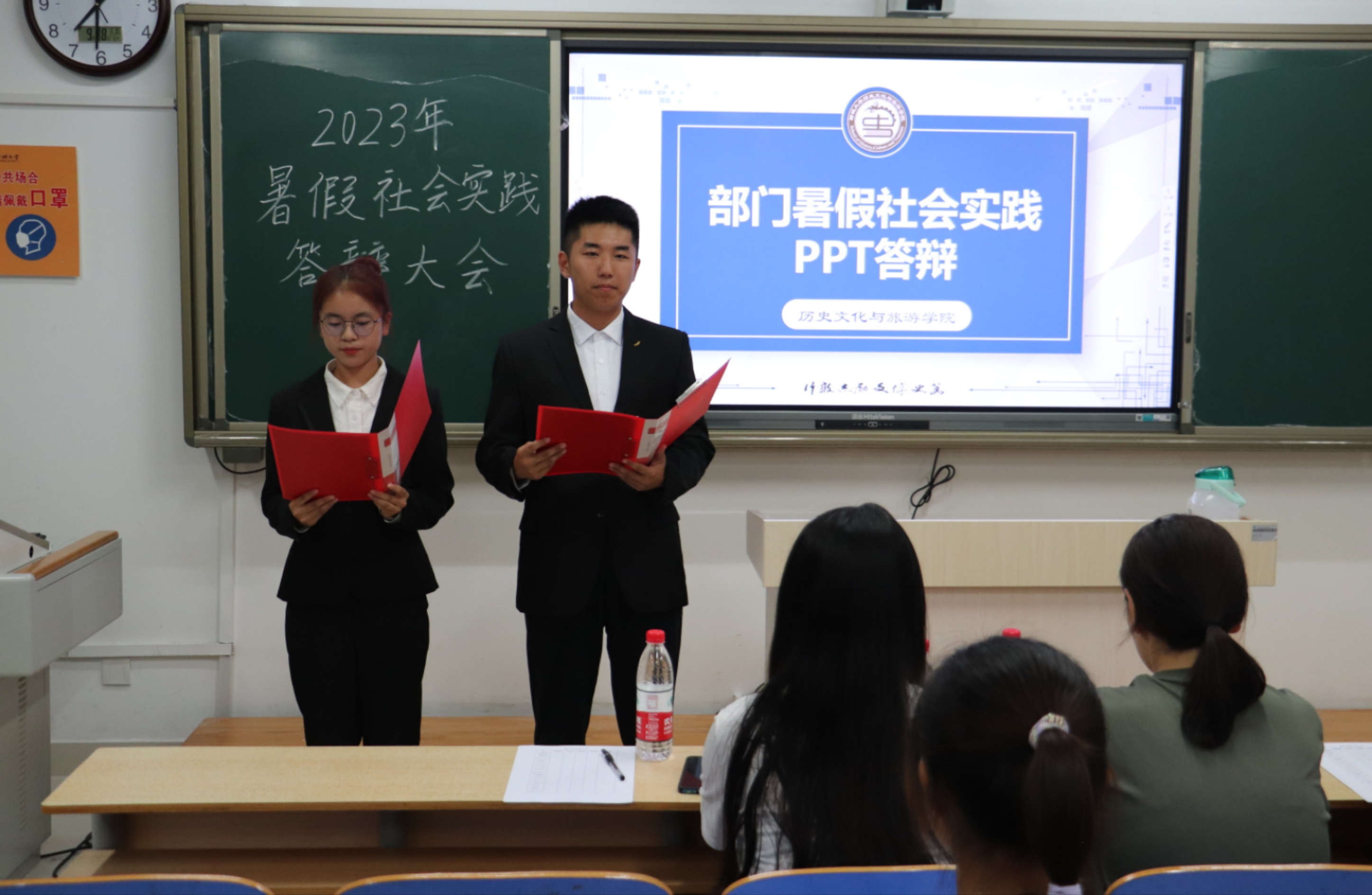 于6#A303和304教室举办2023年暑假社会实践答辩大会。 在主持人的简洁介绍后,暑假社会实践答辩大会正式开始。本次答辩包括班级答辩和学生组织部门答辩两个部分。答辩小组按照抽签顺序依次上台答辩,团委书记石晓晗和学生评委根据答辩人的表现情况及社会实践成果进行点评。在学生组织部门答辩中,“承千年技艺,燃万明古灯”调研服务队深入贯彻习近平总书记关于非物质文化遗产的重要指示精神,调研聊城市非遗传承现状,对非遗文化柳林降狮舞第九代传人杨乃让先生进行了专访,宣传普及降狮舞,引起社会的关注。启蒙晨曦志愿服务队走进聊城市友方康复医院结合历史学的专业特色向孩子们讲解汉字、汉服的起源与名人志士的故事,为残障儿童提供丰富多彩的课程和游戏,用爱心点亮心灯,让残障儿童不孤单。其他服务队就扶幼助弱、体育文化、产业发展、乡村生态振兴、党史学习教育等社会热点问题进行答辩,体现了服务队关心社情、国情,应用所学所能服务社会的品质。 本次以班级为单位进行暑假社会实践活动的队伍共有十支,主要以理论普及宣讲为主题,结合*小妲己直播