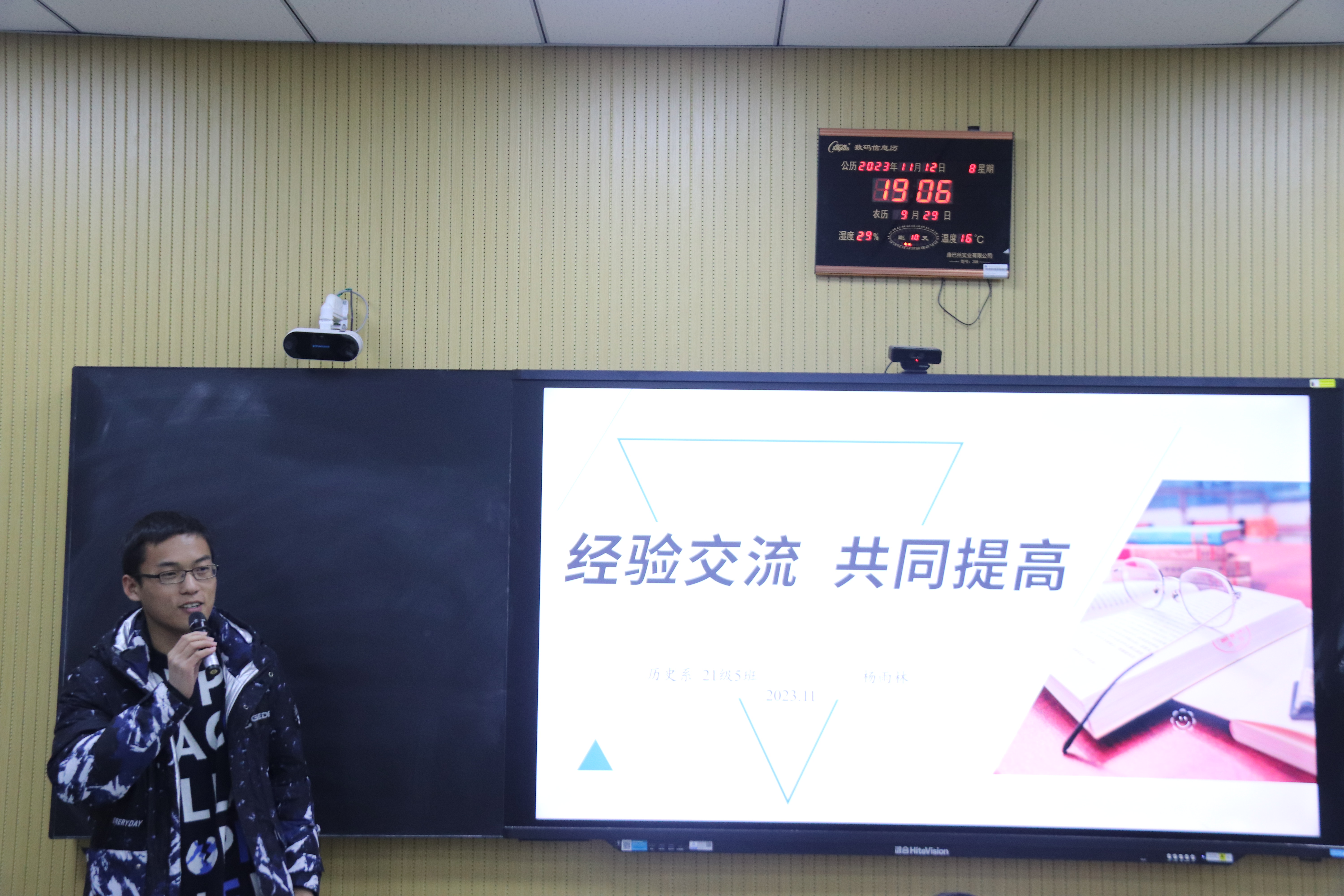 于6#A301教室举办优秀学生经验分享会。本次活动邀请到杨雨林同学进行论文写作方面的经验分享。 首先,杨雨林从大学课程学习面临问题及解决方法展开详细论述。针对大一同学存在的课程学习问题,他给予有效建议,并鼓励同学们在大一期间多阅读,注重日常积累,学会高效记忆。针对大二同学存在课程多、学习压力大等问题,他指出同学们应重视基础学习,学会利用碎片化时间提高学习效率,劳逸结合,做到温故而知新。紧接着,杨雨林为同学们分享论文写作经验。他强调,写好论文要先读好论文。他以李根、周巩固的《海登·怀特的“中间语态”理论及其对历史书写的启发》为例,向同学们展示如何阅读,从读中吸取经验,写好论文。随后,他引用倪凯老师《戈登·柴尔德的进步史观研究》的摘要,逐字逐句向同学们讲解如何写好摘要。同学们纷纷表示受益匪浅。为进一步激发同学们对学术研究的兴趣,杨雨林向同学们推荐《变动的城市》一书,同学们纷纷传阅观看。活动最后,进入提问答疑环节。杨雨林就论文撰写问题进行详细解答,并鼓励同学们涉猎不同领域,多结交志同道合的朋友,常与老师交流经验,将大学生活过的充实而有意义。 知不足而奋进,望远山而力行,本次经验分享会的顺利举办,有利于让同学们收获更多的学习技巧,提高论文写作质量,激发同学们的学习积极性,为深入开展教育教学工作打下坚实基础。 (供稿:魏志鹏 摄影:魏志鹏 初审:张程程 复审:吴志钰 终审:尤姗姗)