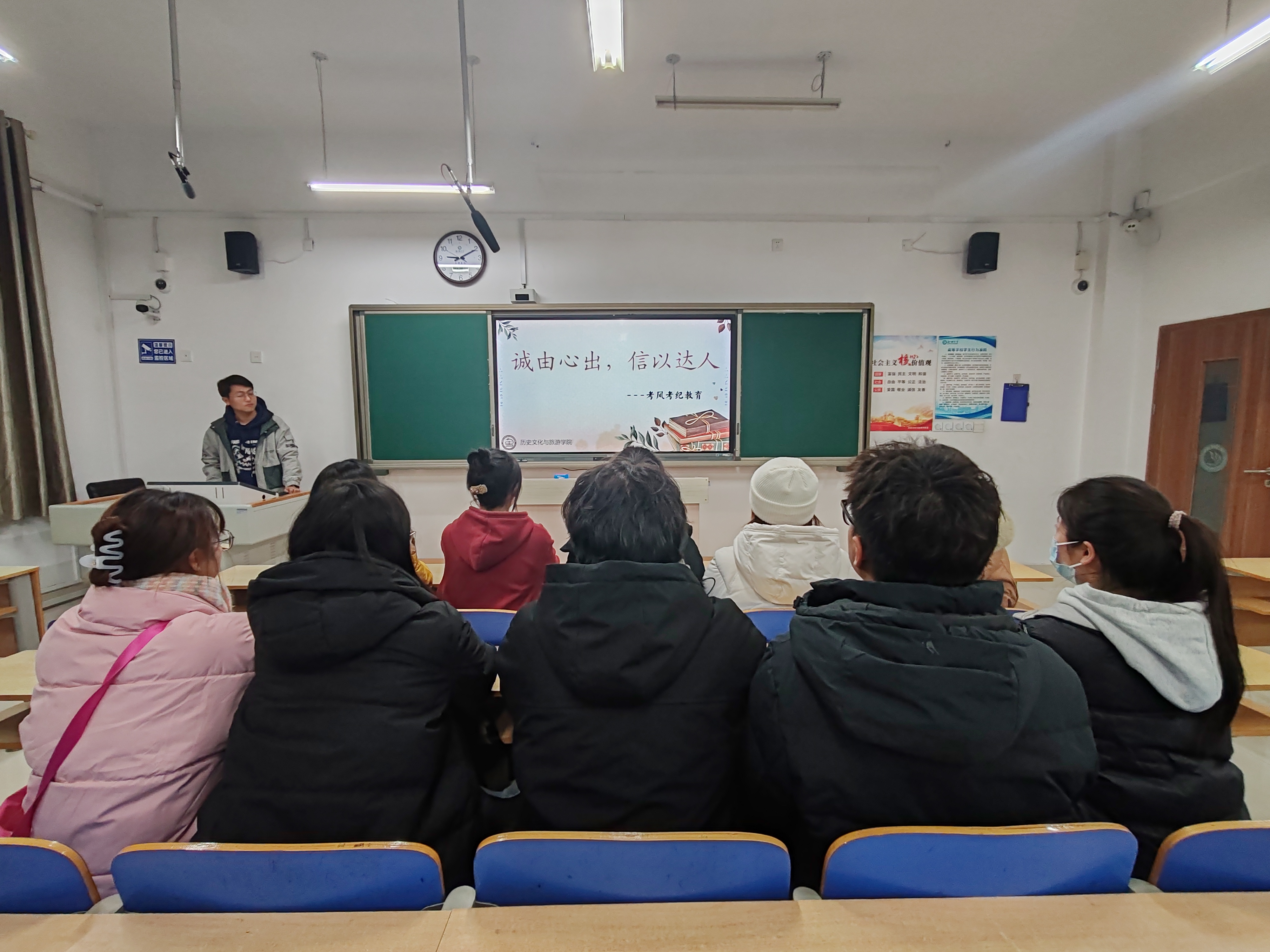 为增强同学们的诚信意识,端正考试态度,营造公平、公正的考试环境,11月21日,我院于6#A405教室举办“诚由心出,信以达人”考风考纪教育活动。 活动伊始,主持人从诚信的概念、价值以及对个人和社会的影响等方面进行讲解。主持人讲道,诚信是中华民族的传统美德,也是社会主义核心价值观的道德基础,树道德之新风,立诚信之根基,是广大青年学生必备的良好品德。在主持人细致的讲解下,同学们充分认识到诚信做人、诚信考试的重要意义。随后,主持人将同学们分成多个小组,围绕“何为诚信”和“如何诚信考试”展开讨论。同学们积极讨论,踊跃发言,积极分享对诚信的见解。为进一步加深同学们对诚信的认识,主讲人依据真实案例向同学们强调诚信对一个人的学习、事业、交际的重要性,同时劝诫同学们不要做缺失诚信的事情,要坚持自己的原则。同学们听后受益匪浅,纷纷表示将会在生活中、学习中严格要求自己,做一个讲诚信的人。活动最后,主持人进行总结发言。主持人鼓励同学们严格遵守考试的规章制度,以实际行动践行诚实守信。 “车无辕而不行,人无信则不立”。本次活动的顺利举办,不仅有利于同学们充分地认识到诚信的重要性,培养同学们的诚信品质,而且有利于提高学院的教育质量,为进一步创建优良学风打下坚实基础。 (供稿 摄影:张雪琳 裴一玮 初审:左麒如 复审:祝豪泽 终审:尤姗姗)