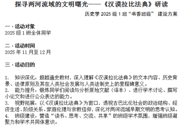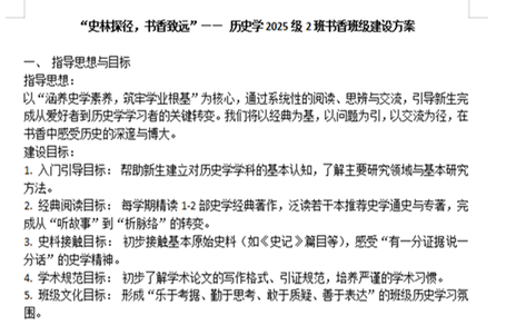 精准锚定学院特色,以班级规范化建设活动月为抓手,创新构建治理新范式,实现班级治理效能革新、育人效能最大化。 书香润史・研学赋能:厚植专业底蕴 学院紧扣学院学科特色,积极构建理论与实践相结合的育人生态。历史学专业以班级为单位组建研学小组,深耕《史记》《治史三书》等典籍,开展史料辨析、学术研讨等活动;旅游管理专业聚焦行业需求,举办运河文化研学分享等活动,推动专业知识与行业实践的深度融合。学院通过线上书单共享、线下专题研讨等形式,全面营造浓厚学习的氛围,助力学生综合素质的提升。 课堂正风・闭环提质:筑牢学业屏障 学院打造全链条课堂管控体系,建立学习委员点名、班委监督、辅导员巡课的机制,聚焦出勤率、学习专注度等指标,切实维护课堂秩序。同时,组织学生签订《文明课堂承诺书》,有效地管控课堂陋习,推动学习氛围日益浓厚。 民主聚气・共治焕活:激活内生动力 学院秉持“务实求真”理念,建立班务议事会制度,保障学生知情权与参与权,并创新“班务阳光公示”,通过线上线下两种渠道,公开班级重大事项等关键信息,实现班级事务透明可溯。 此次建设月累计打造特色活动20余项,修订完善制度30余项,精准破解班级治理中存在的堵点难点。通过系列举措,班级治理实现精细化与学风常态化双提升,为培育新时代青年注入持久动力。 (供稿:胡书宾 陆雅馨 初审:陆雅馨 复审:宋佳珊 终审:尤姗姗)
