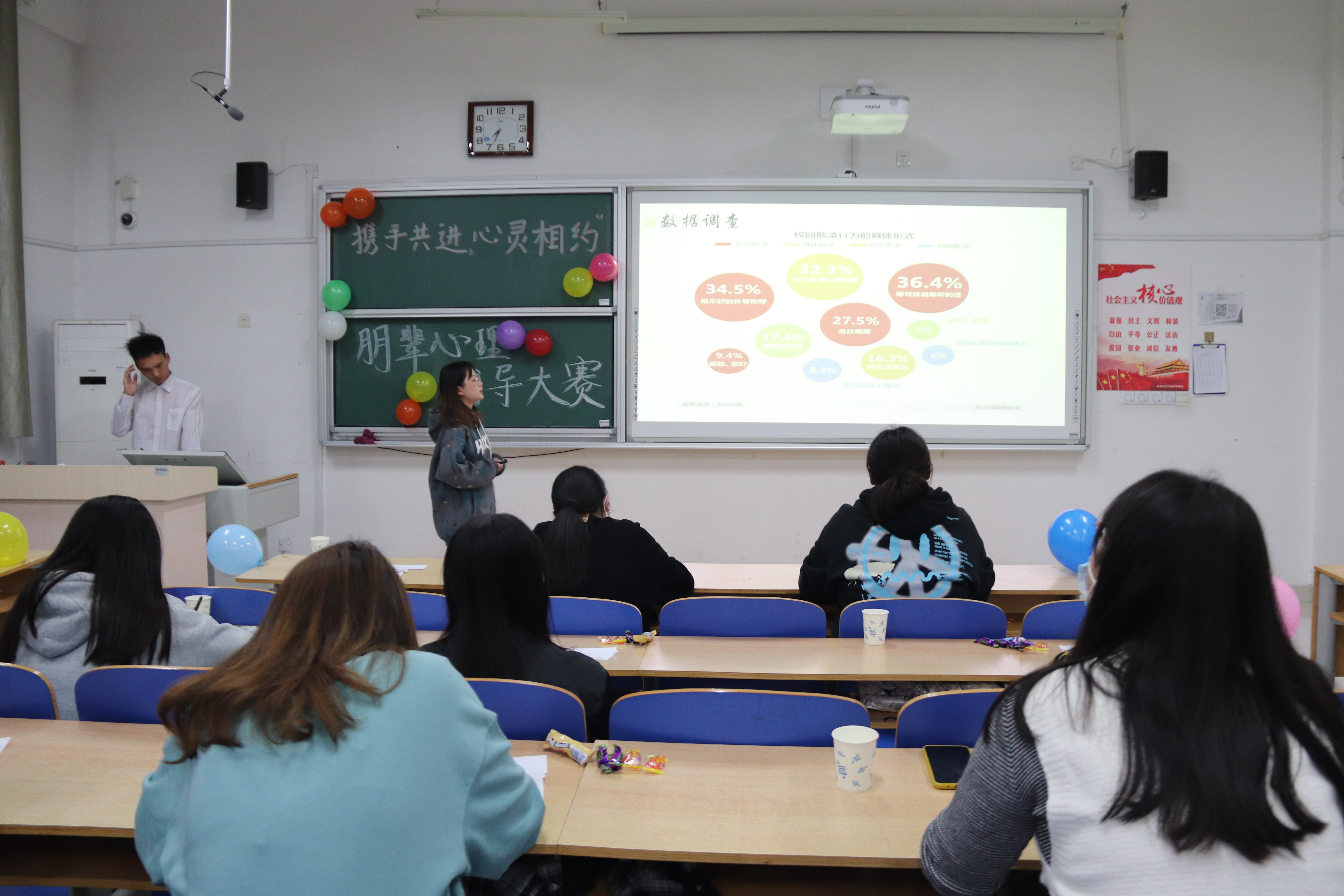 于6#A503举办“携手共进,心灵相约”朋辈心理辅导大赛。院学生会各部门负责人出席本次活动并担任评委。 伴随着热情洋溢的开场白和精彩绝伦的开场舞,本次活动正式拉开帷幕。进入决赛的12名同学围绕心理健康问题,将电影和现实结合,从电影人物形象、 故事情节和画面设计等方面入手,通过精美的PPT和声情并茂的演说,各展风采,为我们带来了一场视听盛宴。其中,吴亦飞同学讲解《成长教育》电影影评,从主人公恋爱经历出发,侃侃而谈,引发同学们对大学生恋爱心理的关注和思考。吕雪莹同学从“校园霸凌”社会现象出发,并通过播放《悲伤逆流成河》相关片段的方式,帮助大学生理解孤独无助的心理情绪,带来心灵的温暖与关怀。张泓锟同学则独出心裁,选择《查理与巧克力工厂》童话电影,突破同学们内心防线,用爱治愈心灵,其语言流畅,内容精美,剧情动人,传达了影片中孩童的纯真与勇气,并凭生动的讲解获得阵阵掌声。紧接着迎来趣味游戏环节——你画我猜,观众积极参加互动,大赛现场气氛融洽活跃。最后经过评委们认真讨论和公平打分,张泓锟获得一等奖,吕雪莹、吴亦飞获得二等奖,赵文洁、石梓萱、王玉获得三等奖。 关注心灵,点燃激情,增强自信。本次大赛的成功举办,不仅彰显电影魅力,给予同学们心灵以温暖和感动,而且有利于提高同学们心理健康水平,培育积极向上的健康心理。