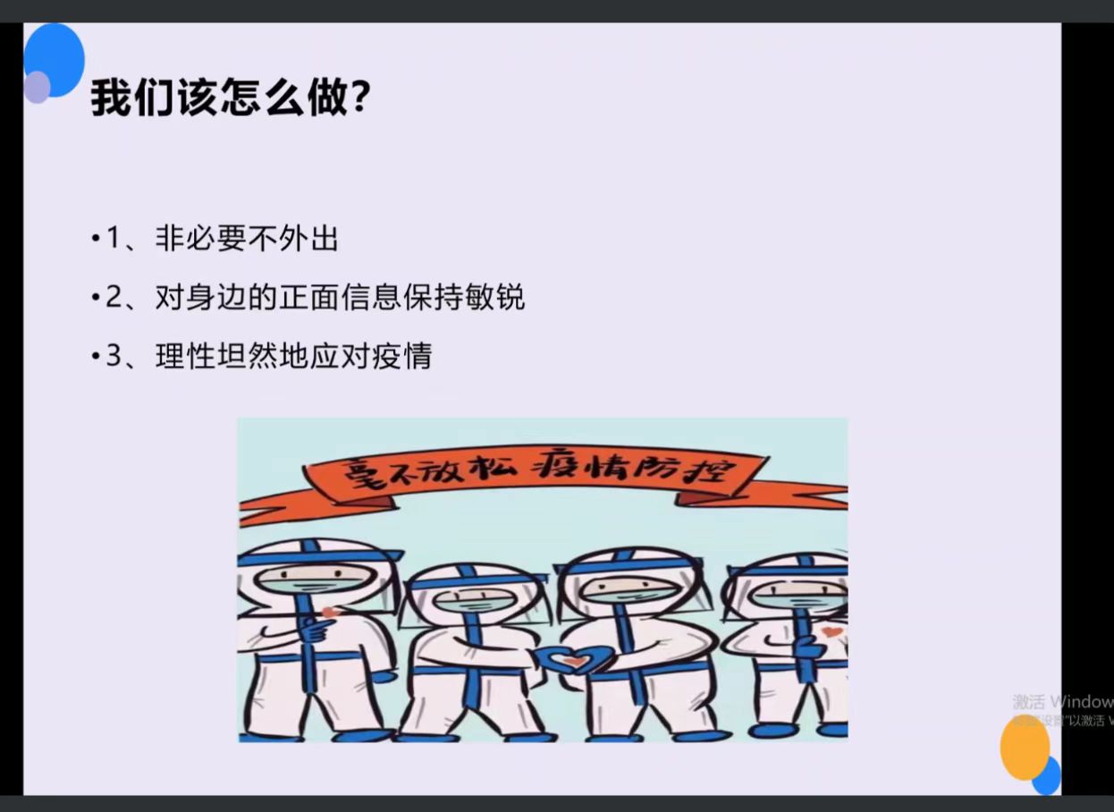 部分学生参与。 活动伊始,主讲人让同学们观察几张动图,根据其运动速度的快慢来判断自己的心理压力程度,相同的图片在同学们眼中展现出的不同运动速度体现了同学们压力程度的差异。以此测试为基点,主讲人又向同学们展示了十二道心理测试题,同学们积极和主讲人进行互动,说出自己的答案,主讲人根据同学们的测试情况帮忙分析其象征意义,耐心温和地回答同学们提出的各种问题。随后,主讲人为同学们解释压力的含义及其来源。压力主要来源于内部压力和外部压力,弄清压力的来源可以及时采取有效措施以达到减轻或消除心理压力的目的。谈及调节情绪的方法时,同学们的方法不计其数,纷纷踊跃表达自己的想法,主讲人也向同学们分享了呼吸减压法和支解法等其他的方法。紧接着,主讲人为大家提供了他人互助型、提高自我型、自娱自乐型和乐于助人型四种类型的心理帮助。针对疫情期间,我们该如何高效前行,主讲人给我们提出了非必要不外出、对身边的正面信息保持敏锐、理性坦然地对待疫情的几点倡议,呼吁同学们放平心态,正视疫情。 本次活动的成功举办,有效地引导了同学们科学认识疫情,积极应对挑战和压力,极大地提高了同学们的心理素质,营造了健康积极的校园氛围。 (图文:马海迪、吴志钰 初审:吴志钰 复审:高晓薇 终审:巨国运)