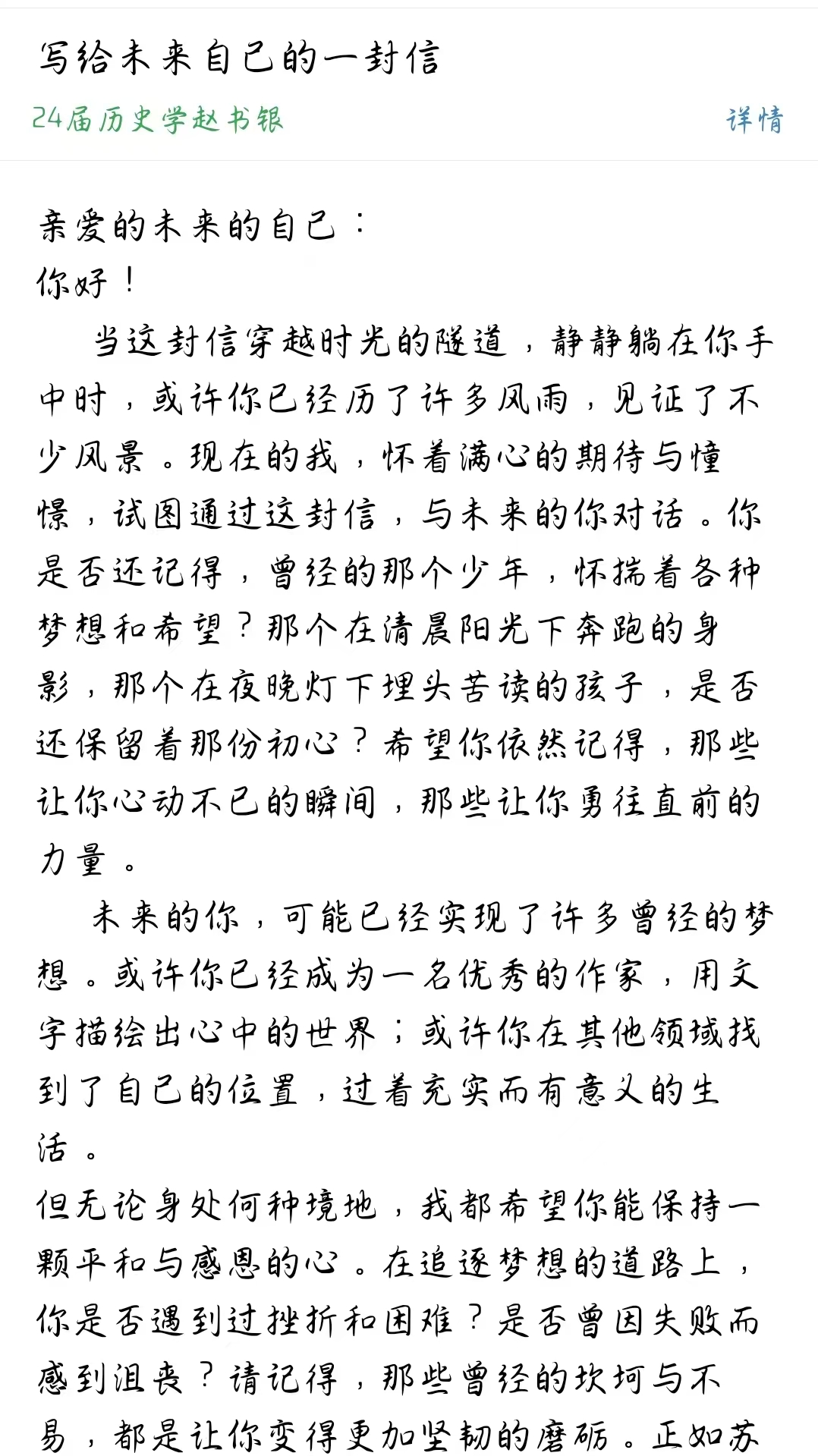 为促进学生心理健康发展,引导其深入探索自己的内心世界,缓解他们面临的各种心理压力,近日,我院于线上举办“线上书梦想,云端寄希望——写给未来自己的一封信”活动。 同学们静心执笔,以文字为媒,将当下的思考、成长的感悟以及对未来的期许倾注于字里行间。每一封书信都是心灵的独白,真实地记录了同学们的情绪起伏与心路历程。这种独特的自我对话方式,既帮助同学们察觉自身潜在的情绪困扰以及未被满足的心理需求,更引导他们从内心世界汲取前行的力量。 活动突破了传统心理辅导的时空局限,以新颖的云端书信形式,营造了自由表达的情感空间。参与同学一致表示,这次书信创作带来了意想不到的心灵收获。在书写过程中,他们通过文字梳理了思绪,释放了压力,对未来的规划也更加清晰。这种创新的心理成长模式,让学生在轻松的氛围中实现了自我探索与提升。 此次活动的顺利举办,不仅为同学们创造了自我疗愈的契机,促进了同学们的自我认知和自我成长,同时也为心理健康发展中心探索多元化线上心理健康服务模式积累了宝贵的经验,助力学院心理健康工作迈向新台阶。 (供稿:王梦 田孟欣 摄影:心理健康发展中心 初审:王舒心 复审:张程程 终审:尤姗姗)