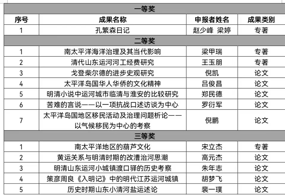 共13项成果获奖,其中一等奖1项,二等奖7项,三等奖5项,在获奖数量和层次上均取得新突破。 近年来,学院高度重视科研成果的培育和申报工作,强化引导科研创新和服务地方经济社会发展,陆续推出有新见、独见和深见的学术成果,科研实力不断提升。下一步,学院将进一步加大对科研项目和成果的培育力度,聚焦学科特色,充分发挥“太平洋岛国研究中心”、“运河学研究院”等平台优势,为建设发展小妲己直播