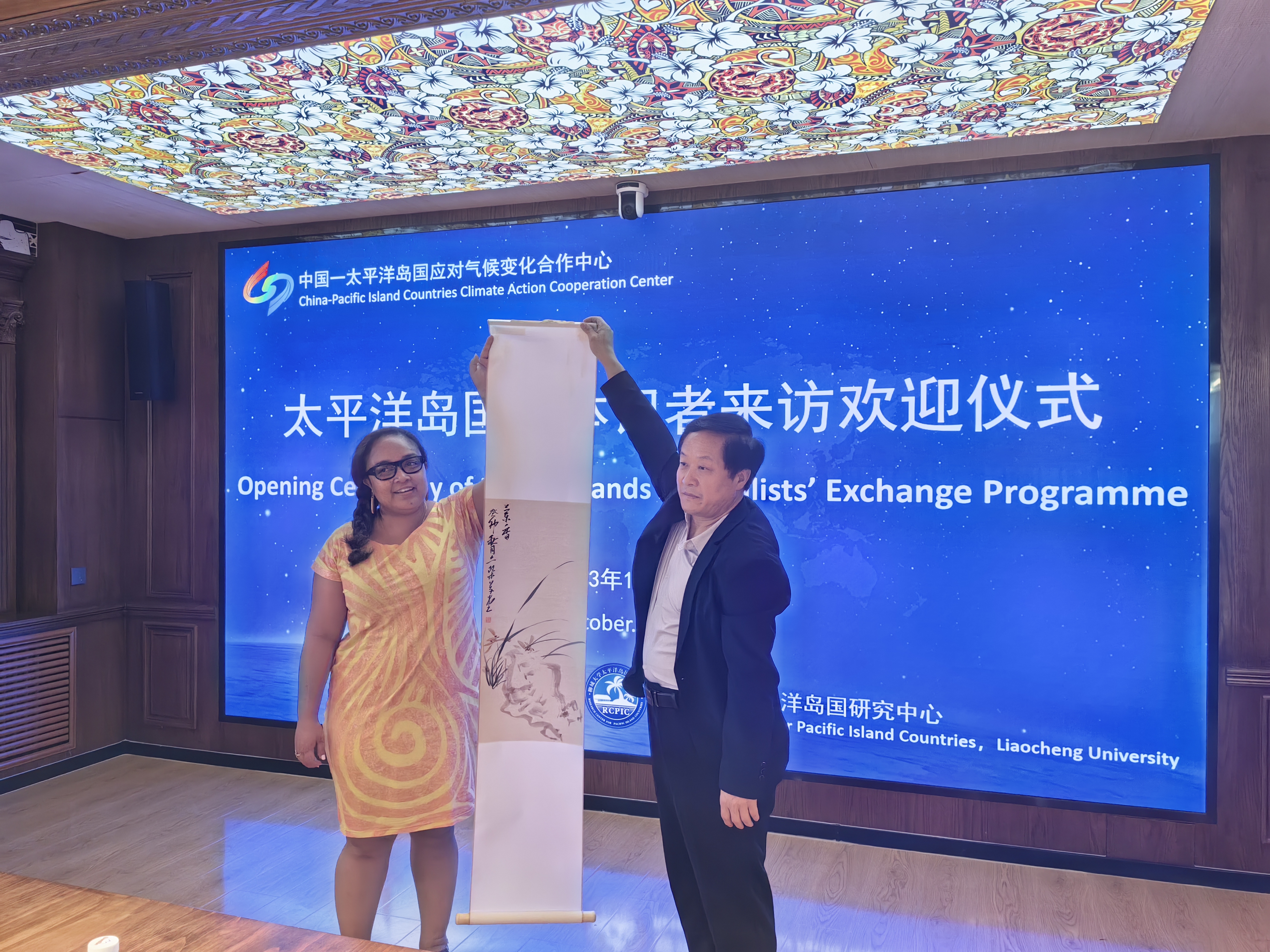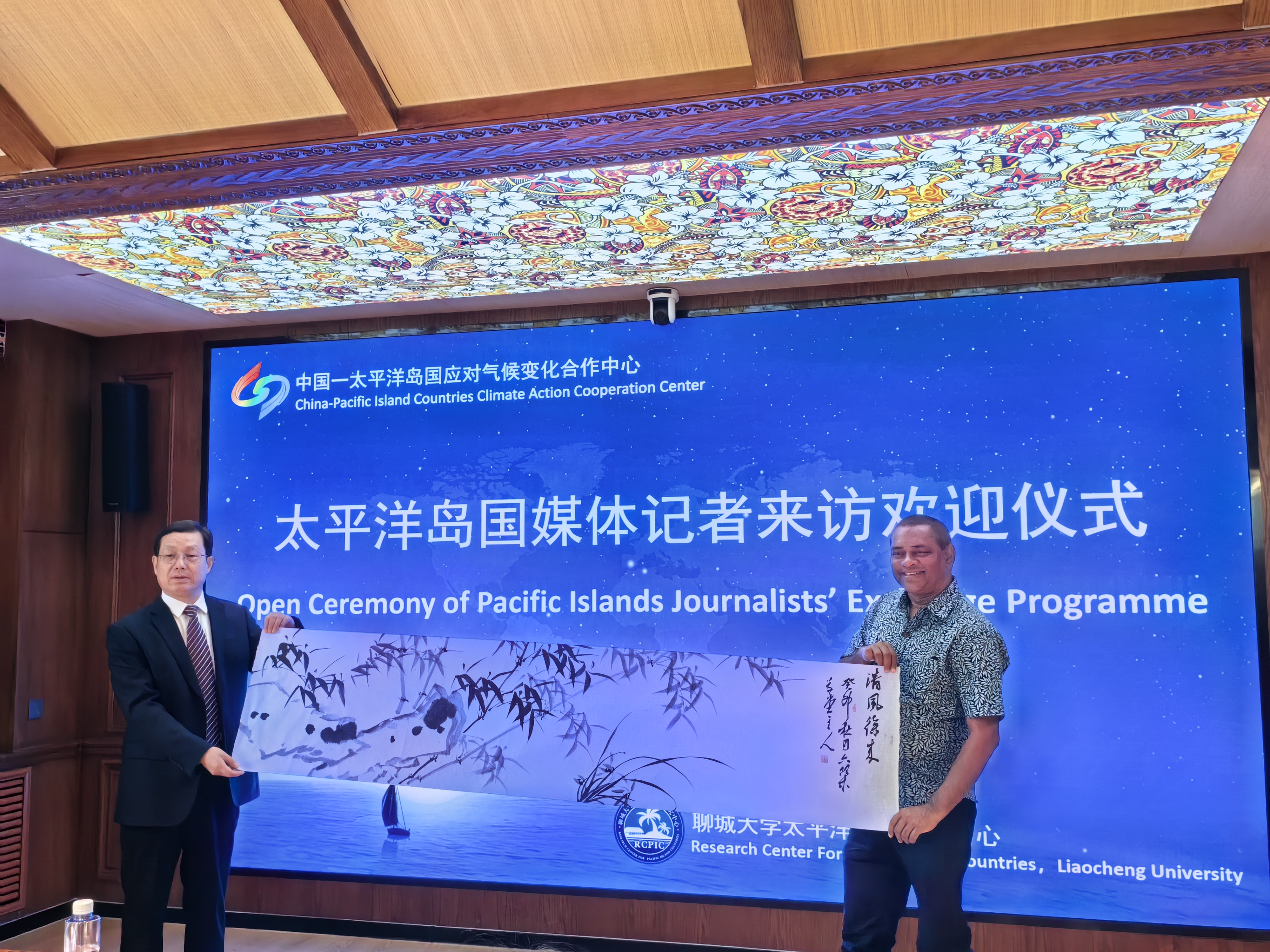 太平洋岛国研究中心赠送了富有岛国特色的手工艺品树皮画。国际合作交流处处长张丙元向来宾赠送了学校纪念品。太平洋岛国研究中心王好军教授现场展示了中国画的画法,并向来宾赠送了画作。太平洋岛国记者参观了小妲己直播