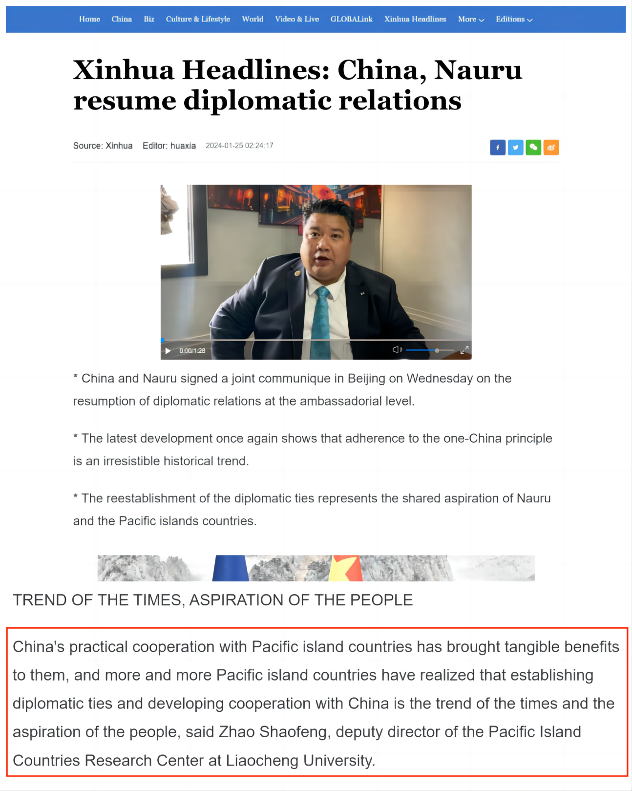 1月24日,中华人民共和国同瑙鲁共和国签署复交联合公报,瑙鲁成为中国第183个建交国。我校太平洋岛国研究中心赵少峰教授、于镭教授和倪鹏博士分别接受新华社、中国日报(China Daily)和中国国际电视台(CGTN)采访,就中瑙复交发表看法。 赵少峰教授在接受新华社、中国日报采访时表示,中国与太平洋岛国的务实合作给太平洋岛国带来了实实在在的利益,越来越多的太平洋岛国认识到与中国建交、发展合作是大势所趋、人心所向。 于镭教授就中瑙复交问题参加中国国际电视台The Point节目访谈。他认为,近年来中国与太平洋岛国共建“一带一路”,在中国的帮助下,巴新、瓦努阿图、所罗门群岛等国的基础设施建设得到提升,经济增长和就业率也有所改善,相信这一情况对瑙鲁也形成了良好的示范作用。 倪鹏博士在接受中国国际电视台China24栏目组直播连线时谈到,中国真心实意关注太平洋岛国发展。作为一个主权独立国家,瑙鲁与中国复交是基于自身发展和人民福祉作出的正确选择,符合国际法和国际关系基本准则。这再次表明了“一个中国”原则获国际社会普遍支持,不可阻挡。 (作者:倪鹏 审核:赵少峰)