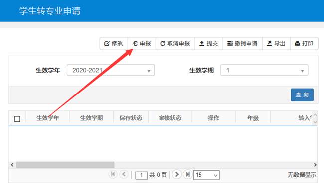 2.在学生转专业申请界面,点击申报按钮