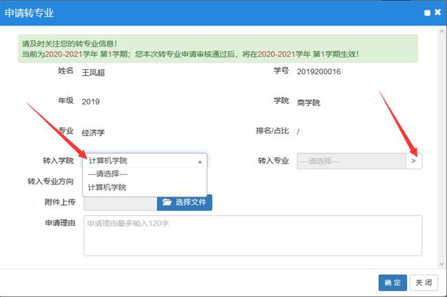 3.在申请转专业界面,选择转入学院,点击转入专业选择框右侧的箭头