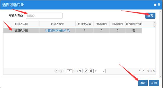 4.在选择可选专业界面,点击查询按钮,选中要转入的专业,点击确定按钮